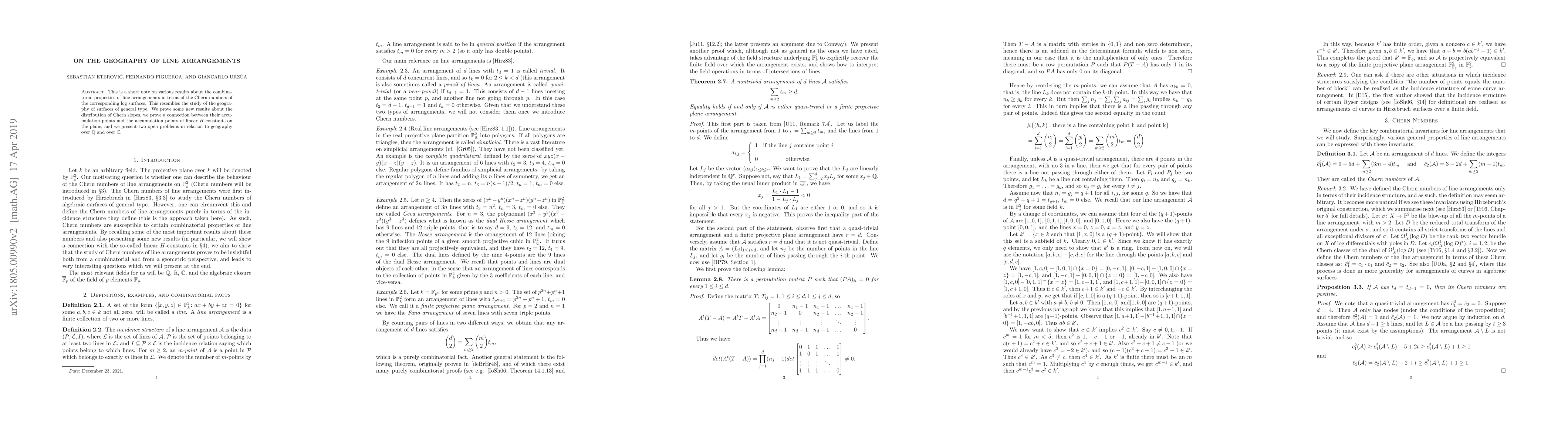 This is a short note on various results about the combinatorial properties of line arrangements in terms of the Chern numbers of the corresponding log surfaces. This resembles the study of the geography of surfaces of general type. We prove some new results about the distribution of Chern slopes, we prove a connection between their accumulation points and the accumulation points of linear $H$-constants on the plane, and we present two open problems in relation to geography over $\mathbb Q$ and over $\mathbb C$.
