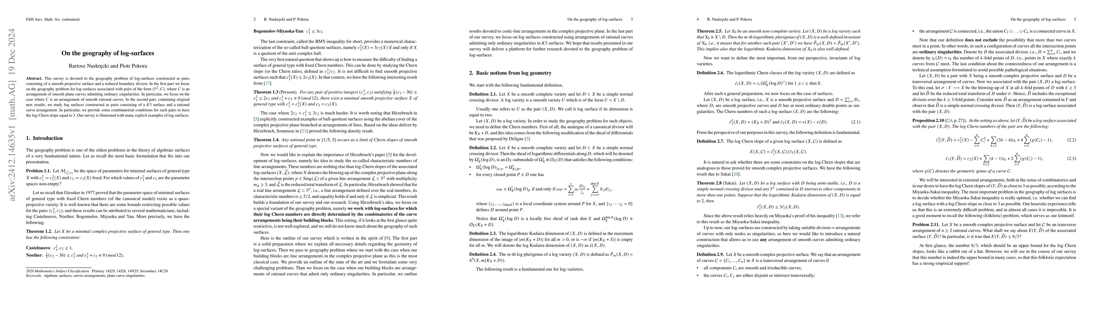 This survey explores the geography of log-surfaces, focusing on two main cases: $(\mathbb{P}^{2}, C)$ with $C$ as an arrangement of smooth rational curves, and pairs formed by $K3$ surfaces with rational curve arrangements, providing new combinatorial conditions for achieving a log-Chern slope of 3. It includes numerous explicit examples to illustrate these findings.