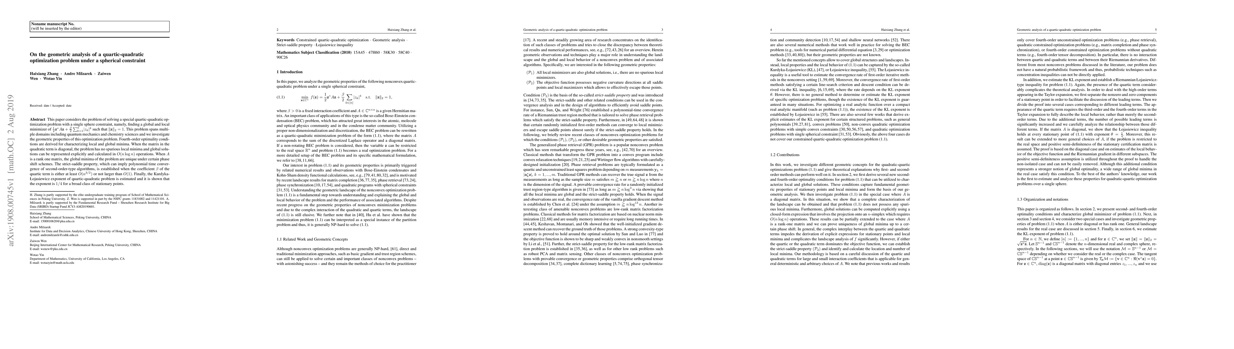 This paper considers the problem of solving a special quartic-quadratic optimization problem with a single sphere constraint, namely, finding a global and local minimizer of $\frac{1}{2}\mathbf{z}^{*}A\mathbf{z}+\frac{\beta}{2}\sum_{k=1}^{n}\lvert z_{k}\rvert^{4}$ such that $\lVert\mathbf{z}\rVert_{2}=1$. This problem spans multiple domains including quantum mechanics and chemistry sciences and we investigate the geometric properties of this optimization problem. Fourth-order optimality conditions are derived for characterizing local and global minima. When the matrix in the quadratic term is diagonal, the problem has no spurious local minima and global solutions can be represented explicitly and calculated in $O(n\log{n})$ operations. When $A$ is a rank one matrix, the global minima of the problem are unique under certain phase shift schemes. The strict-saddle property, which can imply polynomial time convergence of second-order-type algorithms, is established when the coefficient $\beta$ of the quartic term is either at least $O(n^{3/2})$ or not larger than $O(1)$. Finally, the Kurdyka-Lojasiewicz exponent of quartic-quadratic problem is estimated and it is shown that the exponent is ${1}/{4}$ for a broad class of stationary points.