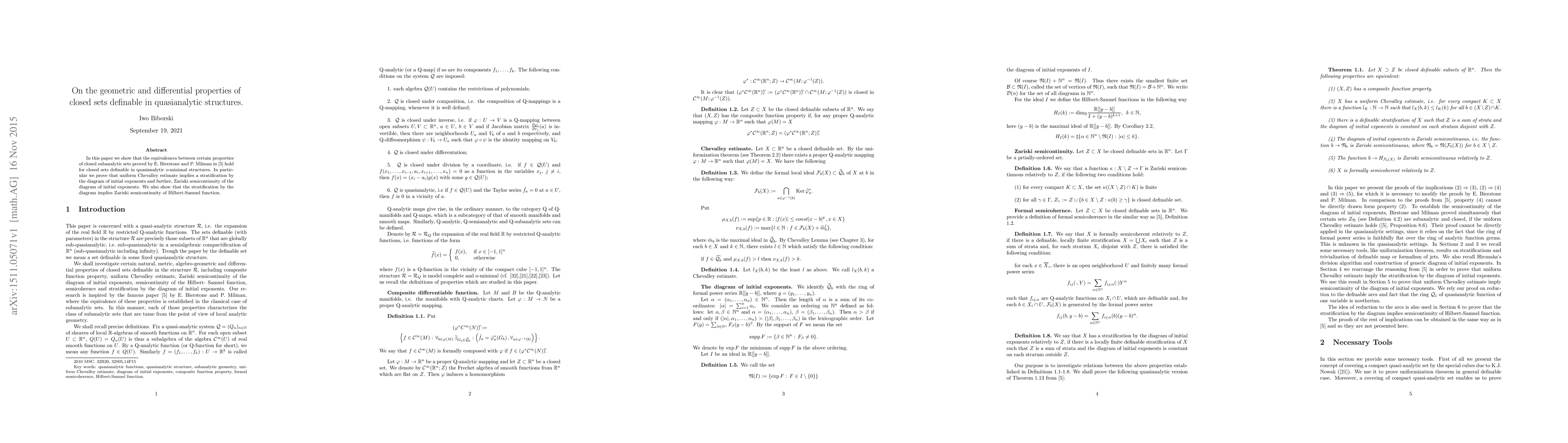 A study on closed sets definable in quasianalytic o-minimal structures proves that certain geometric properties imply others, including stratification and semicontinuity of key functions.