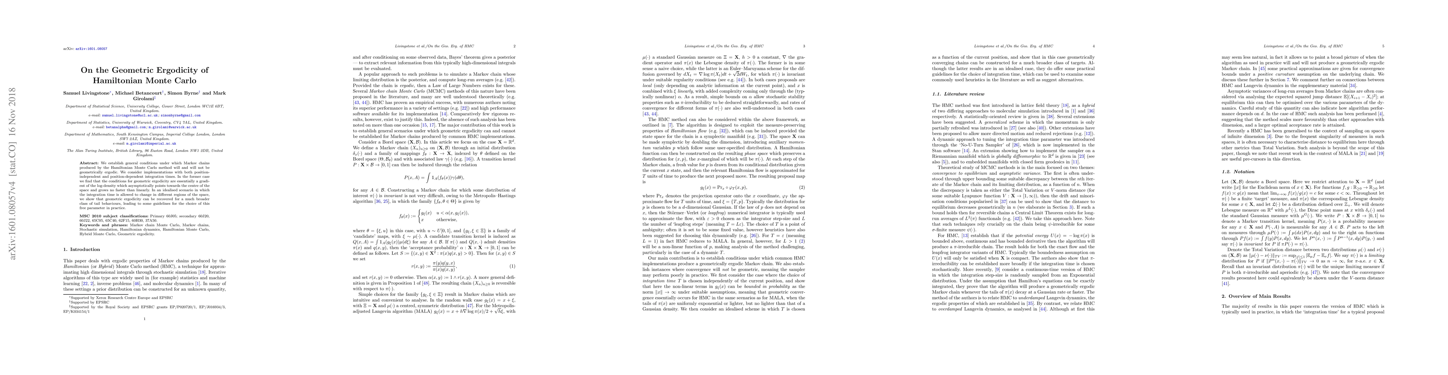 This paper establishes conditions for geometric ergodicity in Markov chains generated by Hamiltonian Monte Carlo, distinguishing between position-independent and position-dependent integration times. It finds that linear growth of the density gradient towards the center ensures ergodicity in the former, while allowing variable integration times can recover ergodicity in a broader range of scenarios.