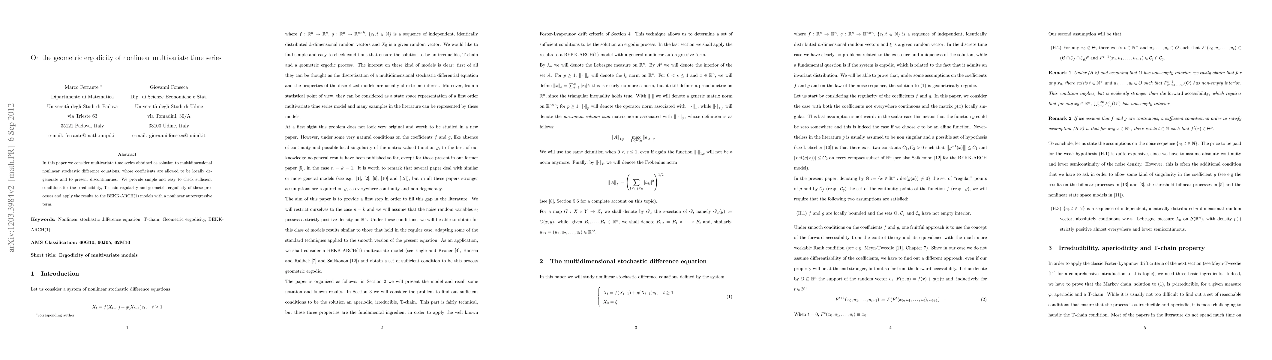 This paper establishes sufficient conditions for irreducibility, T-chain regularity, and geometric ergodicity in multivariate nonlinear time series governed by multidimensional stochastic difference equations. It applies these conditions to BEKK-ARCH(1) models incorporating a nonlinear autoregressive term.
