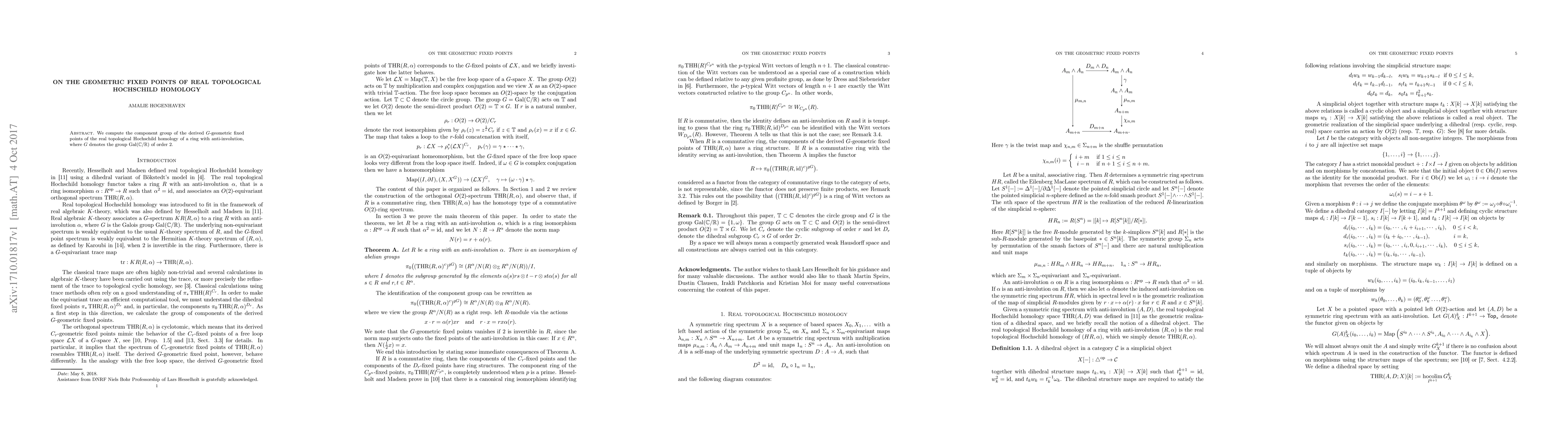 We compute the component group of the derived $G$-geometric fixed points of the real topological Hochschild homology of a ring with anti-involution, where $G$ denotes the Galois group Gal($\mathbb{C}$/$\mathbb{R}$) of order 2.