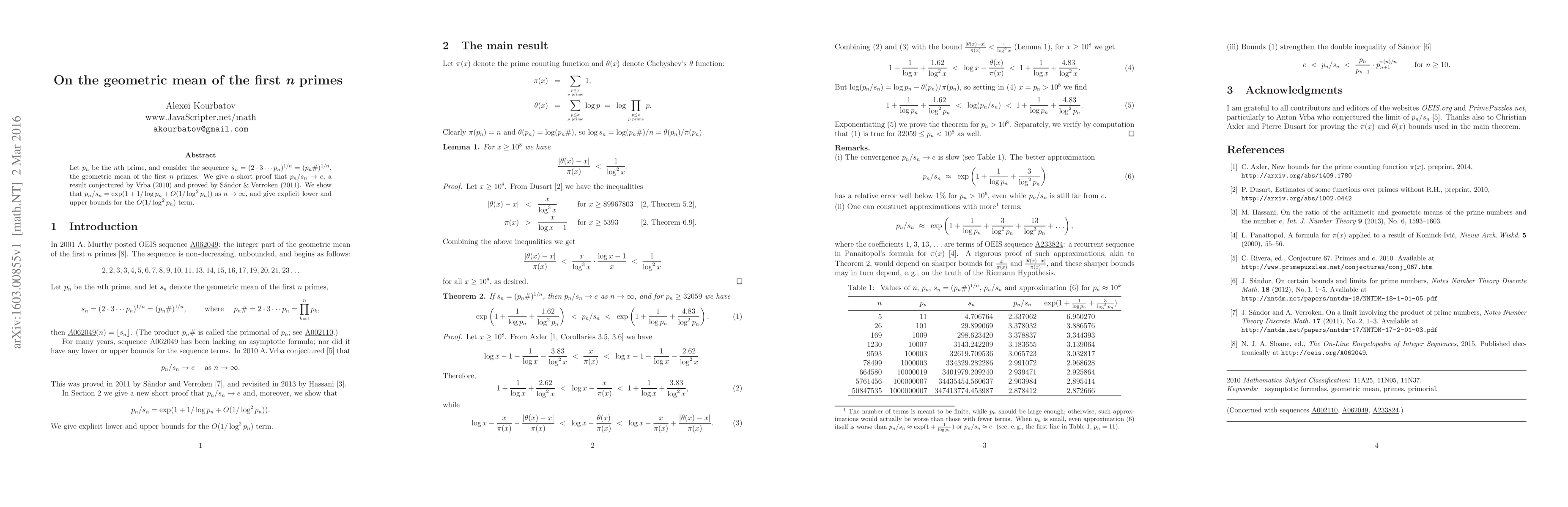 Let $p_n$ be the $n$th prime, and consider the sequence $s_n = (2\cdot3\cdots p_n)^{1/n} = (p_n\#)^{1/n}$, the geometric mean of the first $n$ primes. We give a short proof that $p_n/s_n \to e$, a result conjectured by Vrba (2010) and proved by Sandor and Verroken (2011). We show that $p_n/s_n = \exp(1+1/\log p_n + O(1/\log^2 p_n))$ as $n\to\infty$, and give explicit lower and upper bounds for the $O(1/\log^2 p_n)$ term.