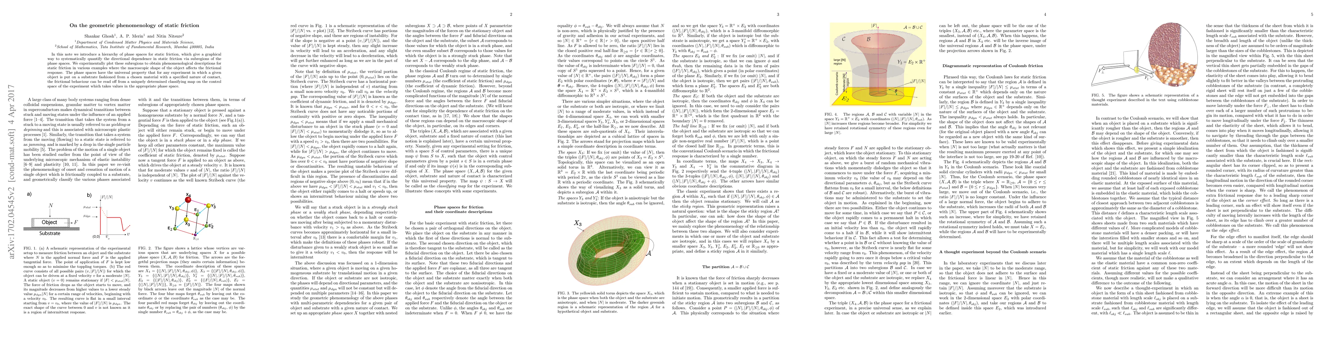 In this note we introduce a hierarchy of phase spaces for static friction, which give a graphical way to systematically quantify the directional dependence in static friction via subregions of the phase spaces. We experimentally plot these subregions to obtain phenomenological descriptions for static friction in various examples where the macroscopic shape of the object affects the frictional response. The phase spaces have the universal property that for any experiment in which a given object is put on a substrate fashioned from a chosen material with a specified nature of contact,the frictional behavior can be read off from a uniquely determined classifying map on the control space of the experiment which takes values in the appropriate phase space.