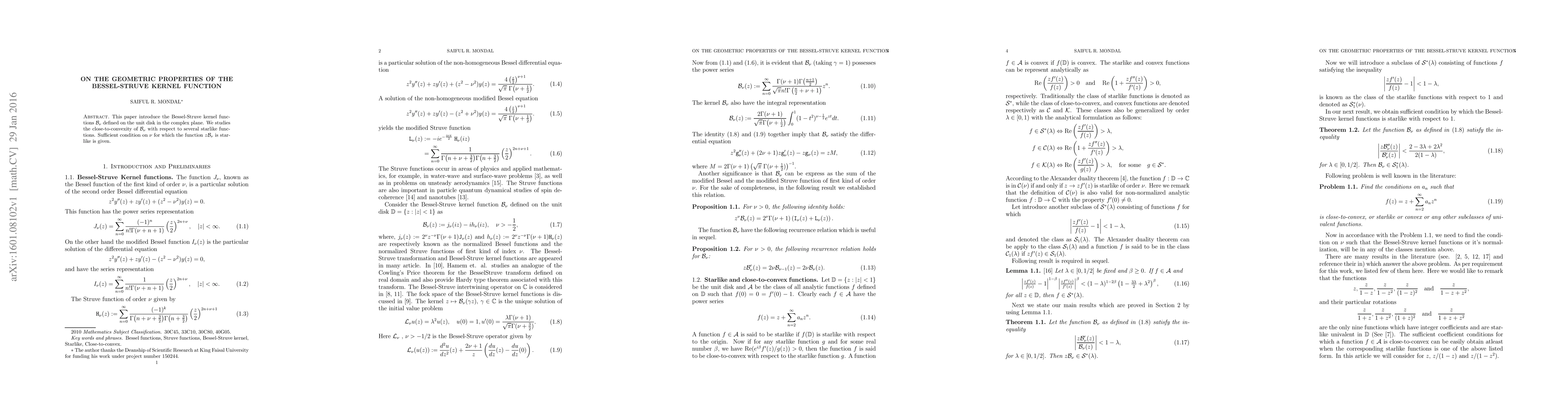 This paper investigates the Bessel-Struve kernel functions $\mathcal{B}_\nu$ on the unit disk, focusing on their geometric properties and close-to-convexity relative to starlike functions, providing a sufficient condition for $z\mathcal{B}_\nu$ to be starlike.