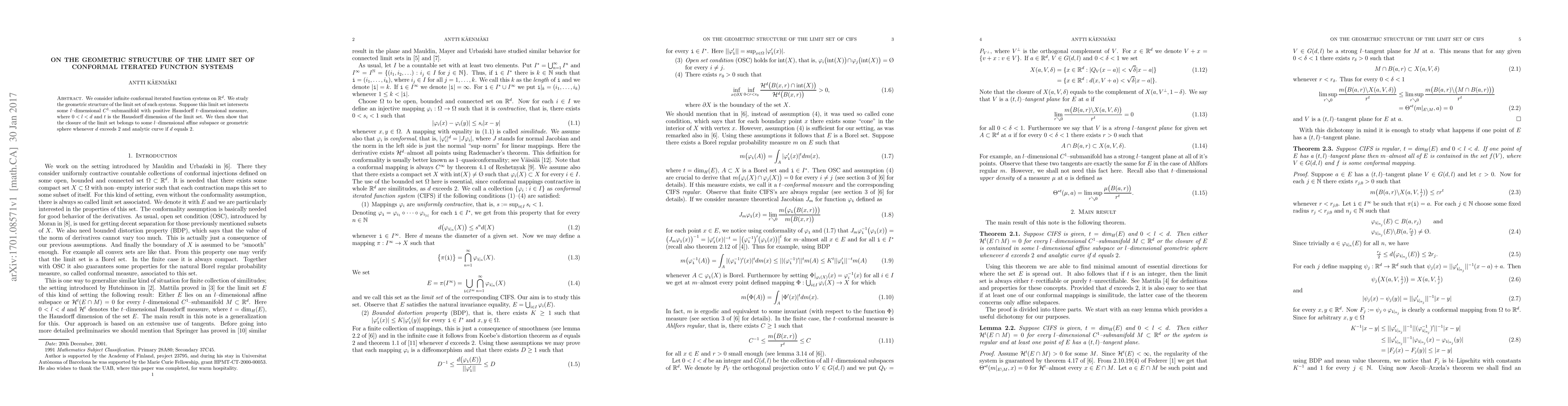 The study finds that for conformal iterated function systems on R^d with d > 2, the limit set's closure belongs to an l-dimensional affine subspace or geometric sphere if it intersects a certain submanifold. For d = 2, the result is more complex and involves analytic curves.