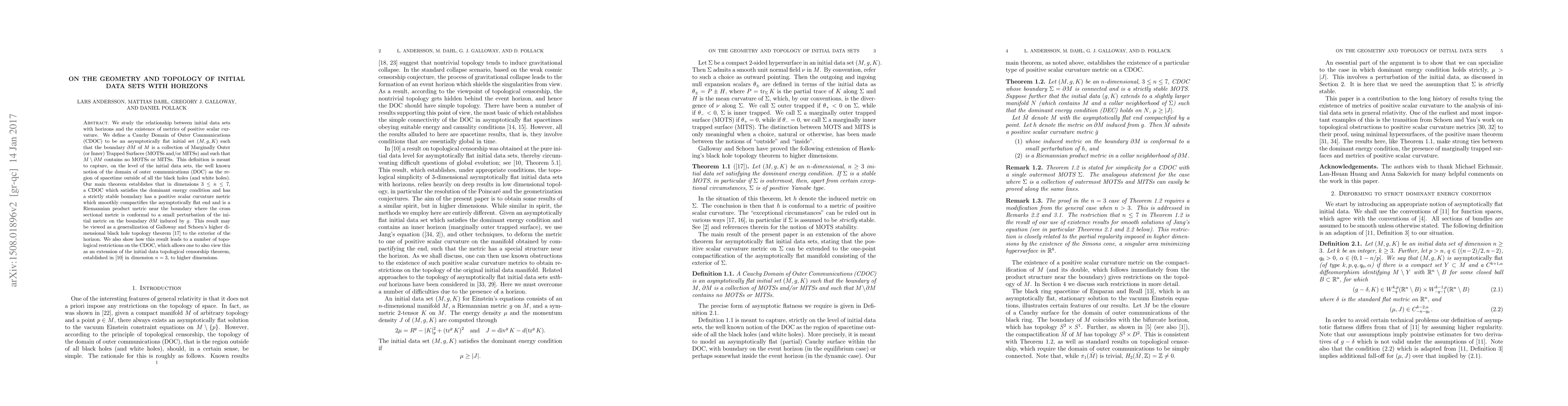 We study the relationship between initial data sets with horizons and the existence of metrics of positive scalar curvature. We define a Cauchy Domain of Outer Communications (CDOC) to be an asymptotically flat initial set $(M, g, K)$ such that the boundary $\partial M$ of $M$ is a collection of Marginally Outer (or Inner) Trapped Surfaces (MOTSs and/or MITSs) and such that $M\setminus \partial M$ contains no MOTSs or MITSs. This definition is meant to capture, on the level of the initial data sets, the well known notion of the domain of outer communications (DOC) as the region of spacetime outside of all the black holes (and white holes). Our main theorem establishes that in dimensions $3\leq n \leq 7$, a CDOC which satisfies the dominant energy condition and has a strictly stable boundary has a positive scalar curvature metric which smoothly compactifies the asymptotically flat end and is a Riemannian product metric near the boundary where the cross sectional metric is conformal to a small perturbation of the initial metric on the boundary $\partial M$ induced by $g$. This result may be viewed as a generalization of Galloway and Schoen's higher dimensional black hole topology theorem \cite{GS06} to the exterior of the horizon. We also show how this result leads to a number of topological restrictions on the CDOC, which allows one to also view this as an extension of the initial data topological censorship theorem, established in \cite{EGP13} in dimension $n=3$, to higher dimensions.