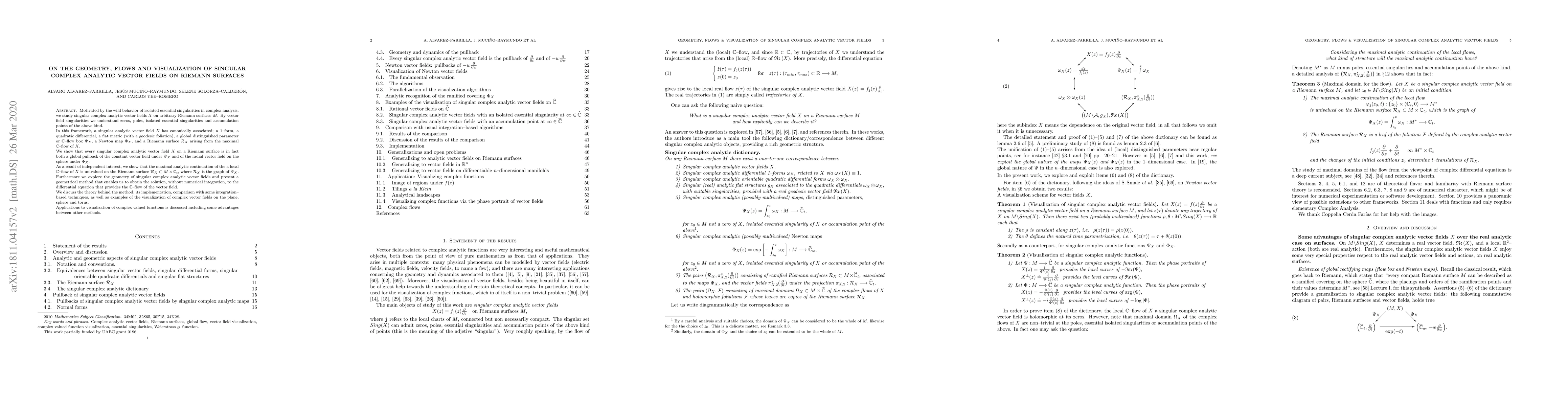 This paper investigates singular complex analytic vector fields on Riemann surfaces, exploring their associated geometric structures and flows. It demonstrates that these vector fields can be globally related to constant and radial vector fields, and presents a novel method for solving their differential equations without numerical integration, with applications to visualizing complex functions.