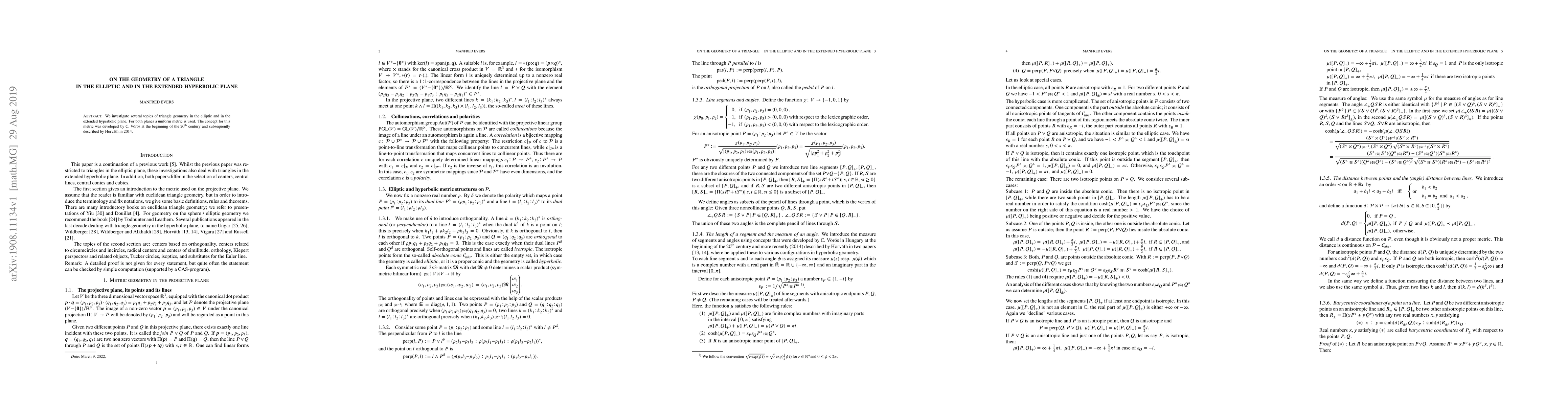 This paper explores various geometric centers and properties of triangles in the elliptic and extended hyperbolic plane, including orthogonality-based centers, circumcircle and incircle-related centers, and substitutes for the Euler line, all under a uniform metric.