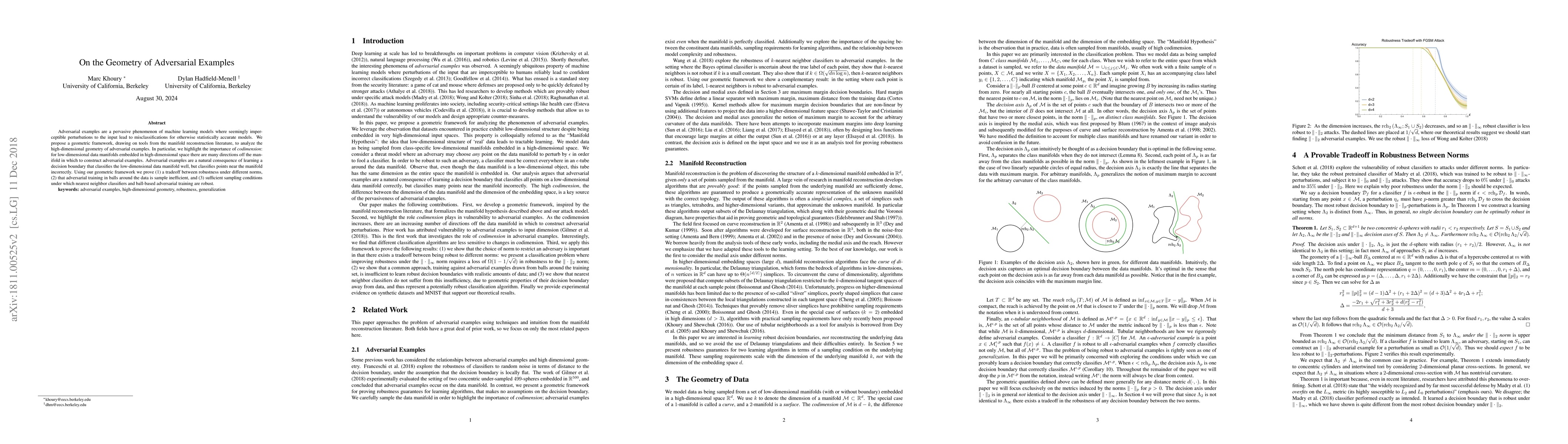 Researchers developed a geometric framework to analyze adversarial examples, showing that the tradeoff between robustness under different norms affects their construction. The study provides insights into sufficient sampling conditions for robust nearest neighbor classifiers and ball-based adversarial training.