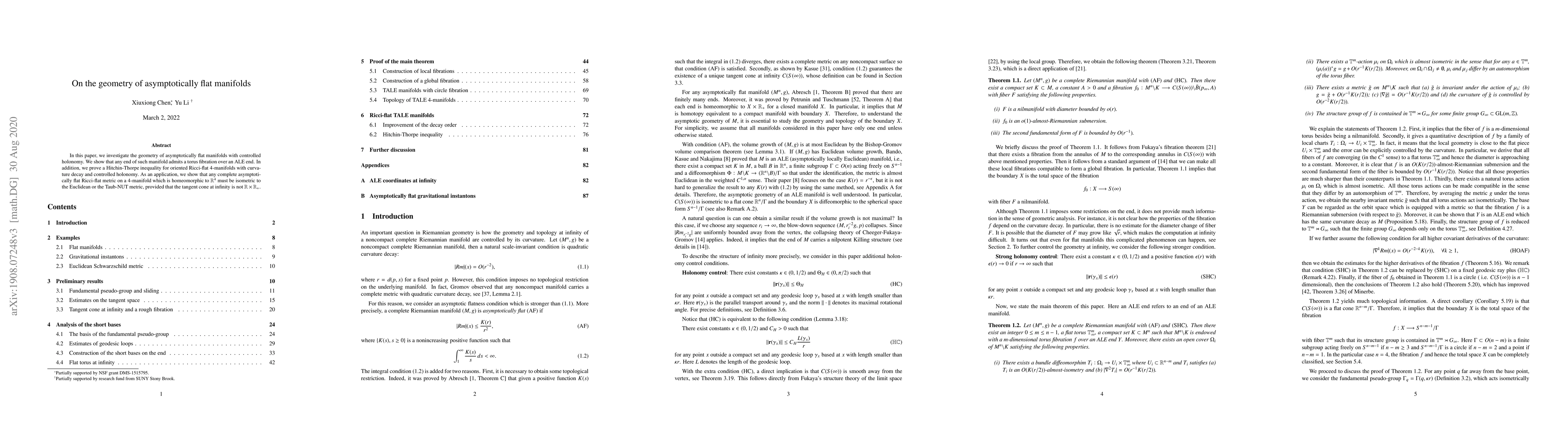 This paper explores the geometry of asymptotically flat manifolds with controlled holonomy, proving that any end admits a torus fibration over an ALE end and establishing a Hitchin-Thorpe inequality for Ricci-flat $4$-manifolds. It concludes by showing that complete asymptotically flat Ricci-flat metrics on $4$-manifolds homeomorphic to $\mathbb R^4$ are isometric to the Euclidean or Taub-NUT metrics, barring specific cone conditions.