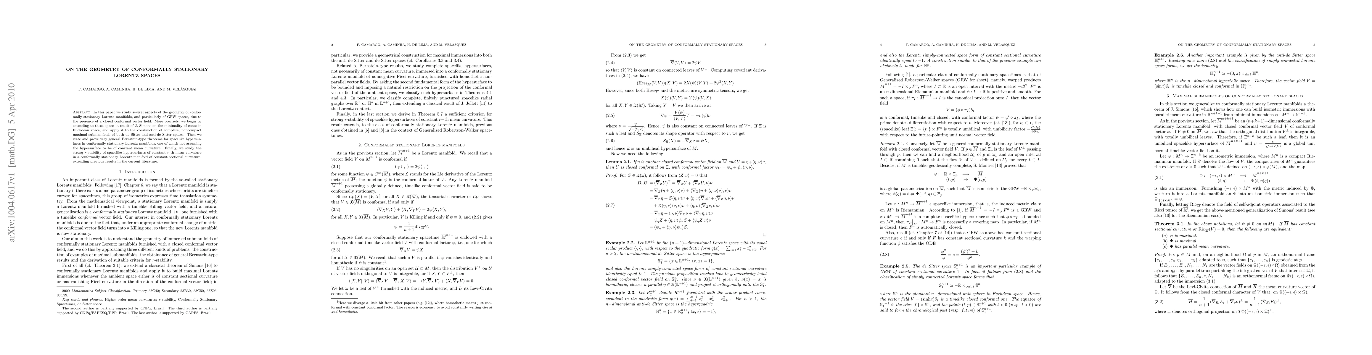 This paper explores the geometry of conformally stationary Lorentz manifolds, particularly GRW spaces with closed conformal vector fields. It extends Simons' minimality result to construct maximal submanifolds in de Sitter and anti-de Sitter spaces, proves general Bernstein-type theorems for spacelike hypersurfaces, and examines the strong $r$-stability of spacelike hypersurfaces with constant $r$-th mean curvature in manifolds of constant sectional curvature.