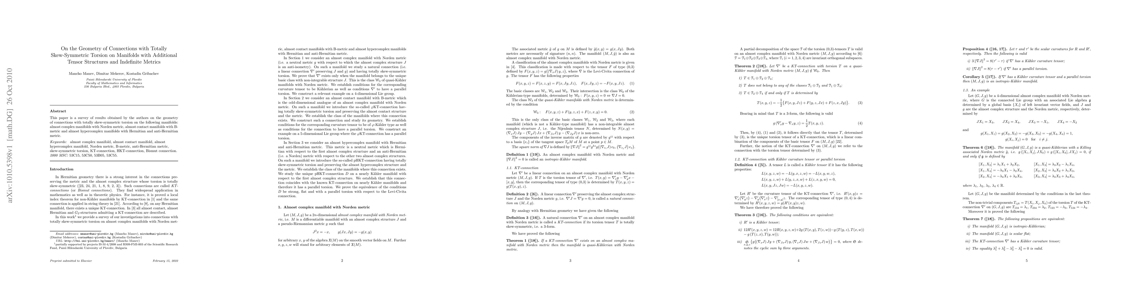 This paper surveys the geometry of connections with totally skew-symmetric torsion on various types of manifolds, including almost complex, almost contact, and almost hypercomplex manifolds equipped with Norden, B-metric, and Hermitian/anti-Hermitian metrics.