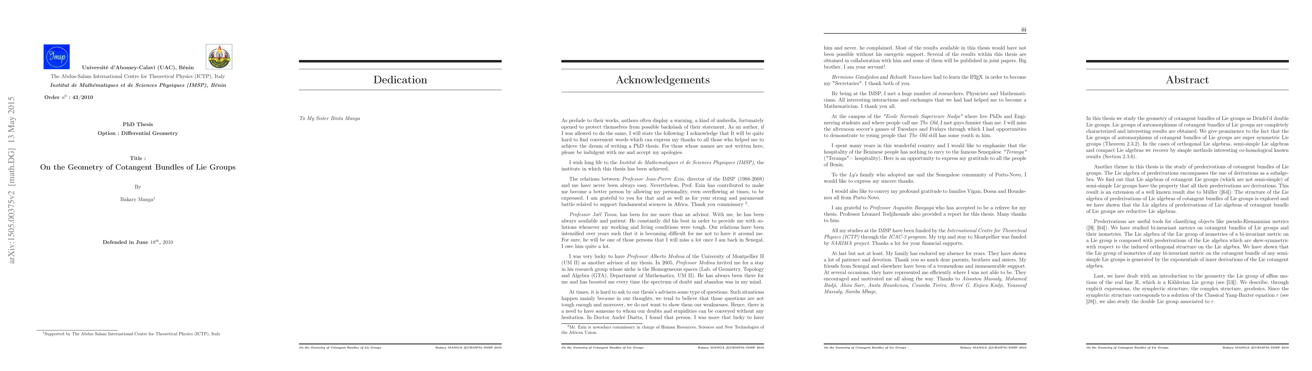 Lie groups of automorphisms of cotangent bundles of Lie groups are completely characterized and interesting results are obtained. We give prominence to the fact that the Lie groups of automorphisms of cotangent bundles of Lie groups are super symmetric Lie groups. In the cases of orthogonal Lie lgebras, semi-simple Lie algebras and compact Lie algebras we recover by simple methods interesting co-homological known results. The Lie algebra of prederivations encompasses the one of derivations as a subalgebra. We find out that Lie algebras of cotangent Lie groups (which are not semi-simple) of semi-simple Lie groups have the property that all their prederivations are derivations. This result is an extension of a well known result due to M\"uller. The structure of the Lie algebra of prederivations of Lie algebras of cotangent bundles of Lie groups is explored and we have shown that the Lie algebra of prederivations of Lie algebras of cotangent bundle of Lie groups are reductive Lie algebras. We have studied bi-invariant metrics on cotangent bundles of Lie groups and their isometries. The Lie algebra of the Lie group of isometries of a bi-invariant metric on a Lie group is composed with prederivations of the Lie algebra which are skew-symmetric with respect to the induced orthogonal structure on the Lie algebra. We have shown that the Lie group of isometries of any bi-invariant metric on the cotangent bundle of any semi-simple Lie groups is generated by the exponentials of inner derivations of the Lie cotangent algebra. Last, we have dealt with an introduction to the geometry the Lie group of affine motions of the real line $\mathbb R$, which is a K\"ahlerian Lie group.