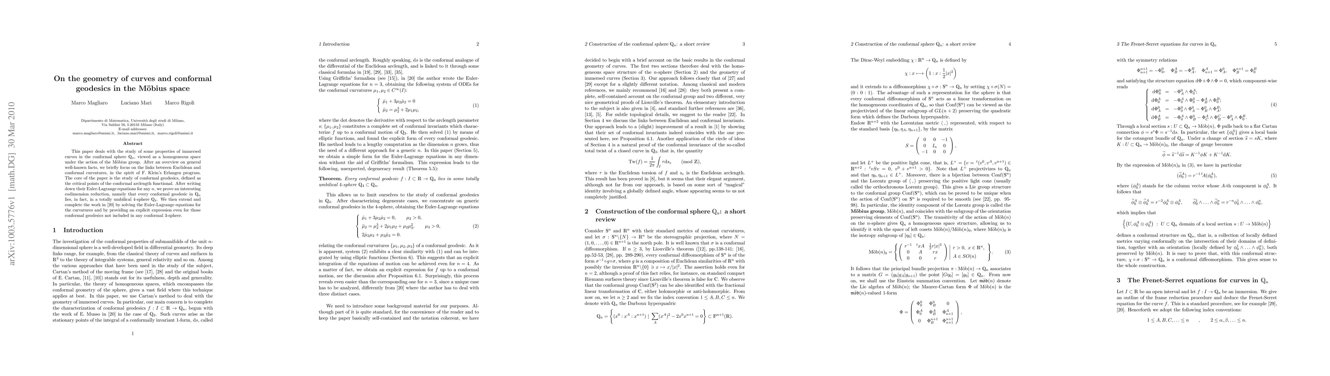 The paper employs a geometric approach, focusing on the conformal sphere Q_n as a homogeneous space under the action of the Möbius group, and studies properties of immersed curves using Euclidean and conformal curvatures.