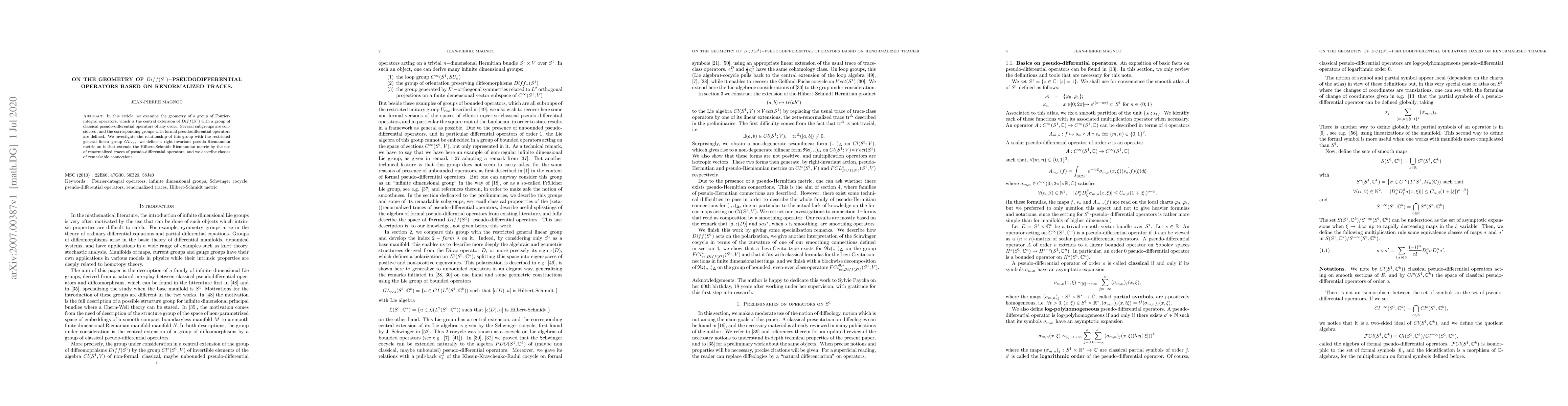 This paper explores the geometry of a central extension of the $Diff(S^1)$ group using Fourier-integral operators, defining subgroups and formal pseudodifferential operators. It introduces a right-invariant pseudo-Riemannian metric based on renormalized traces and examines connections between this group and the restricted general linear group $GL_{res}$.