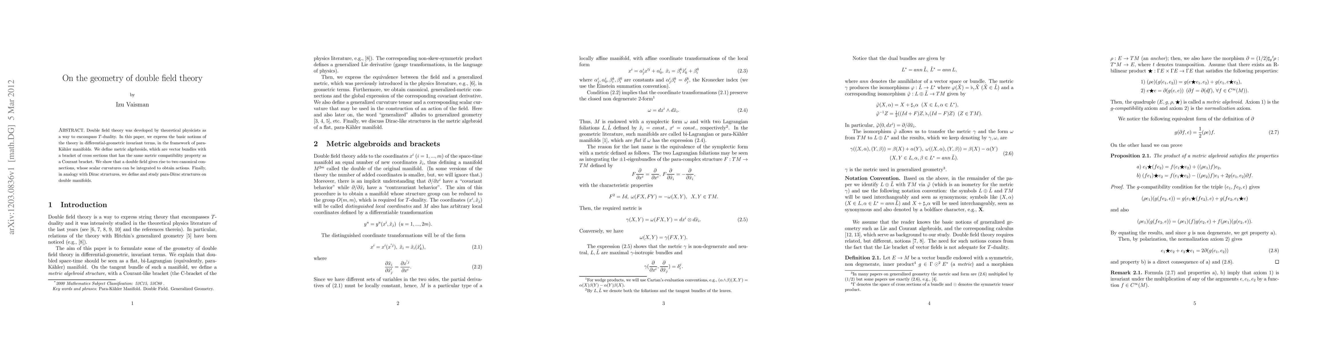 Double field theory was developed by theoretical physicists as a way to encompass $T$-duality. In this paper, we express the basic notions of the theory in differential-geometric invariant terms, in the framework of para-Kaehler manifolds. We define metric algebroids, which are vector bundles with a bracket of cross sections that has the same metric compatibility property as a Courant bracket. We show that a double field gives rise to two canonical connections, whose scalar curvatures can be integrated to obtain actions. Finally, in analogy with Dirac structures, we define and study para-Dirac structures on double manifolds.