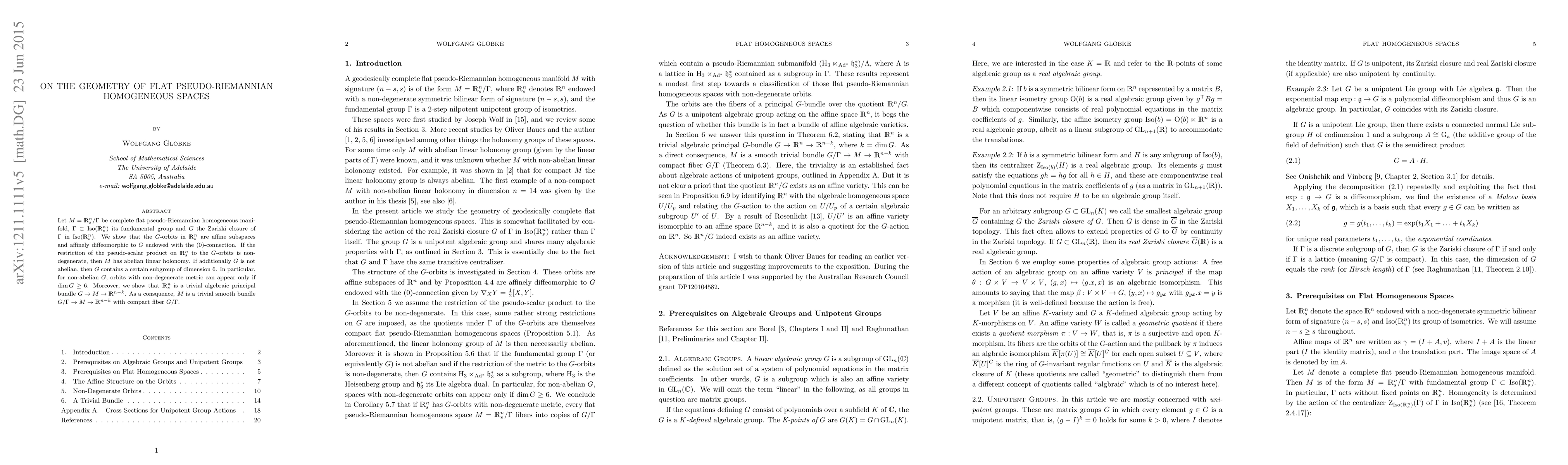 This paper investigates the geometry of flat pseudo-Riemannian homogeneous spaces, demonstrating that they form trivial fiber bundles $G/\Gamma\to M\to\RR^{n-k}$. It also reveals that $G$-orbits in $\RR^n_s$ are affinely diffeomorphic to $G$ with a (0)-connection, and non-degenerate metrics imply linear abelian holonomy for $G$, with non-abelian $G$ requiring dimension at least 6.