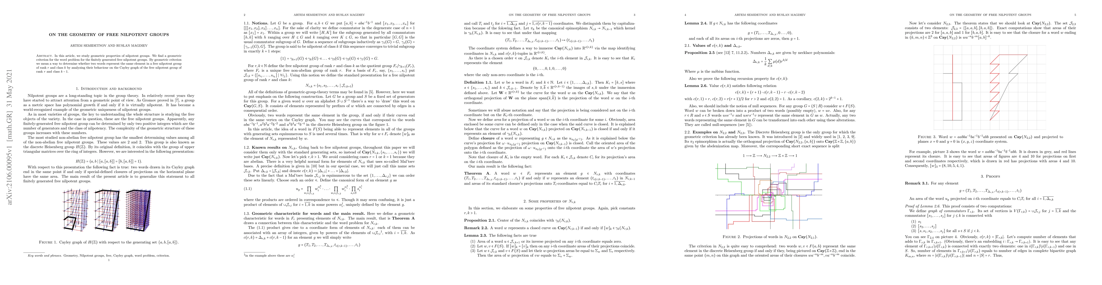 In this article, we study geometric properties of nilpotent groups. We find a geometric criterion for the word problem for the finitely generated free nilpotent groups. By geometric criterion, we mean a way to determine whether two words represent the same element in a free nilpotent group of rank $r$ and class $k$ by analyzing their behavior on the Cayley graph of the free nilpotent group of rank $r$ and class $k-1$.