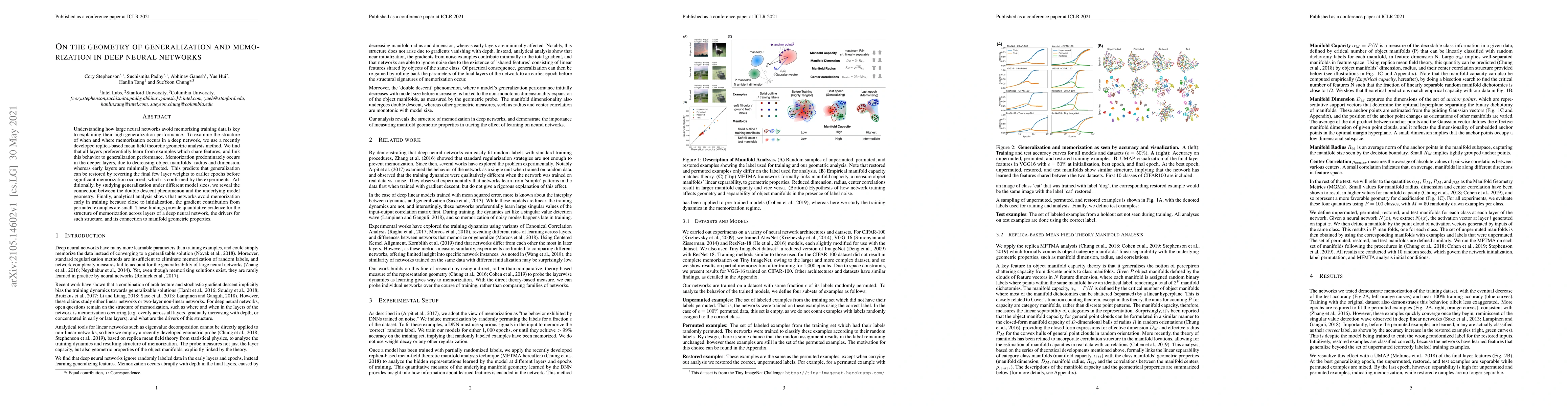 This paper uses replica-based mean field theory to analyze how deep neural networks generalize despite memorizing training data. It finds that memorization mainly occurs in deeper layers due to shrinking object manifolds, while early layers retain better generalization, suggesting that reverting final layers' weights can restore generalization.