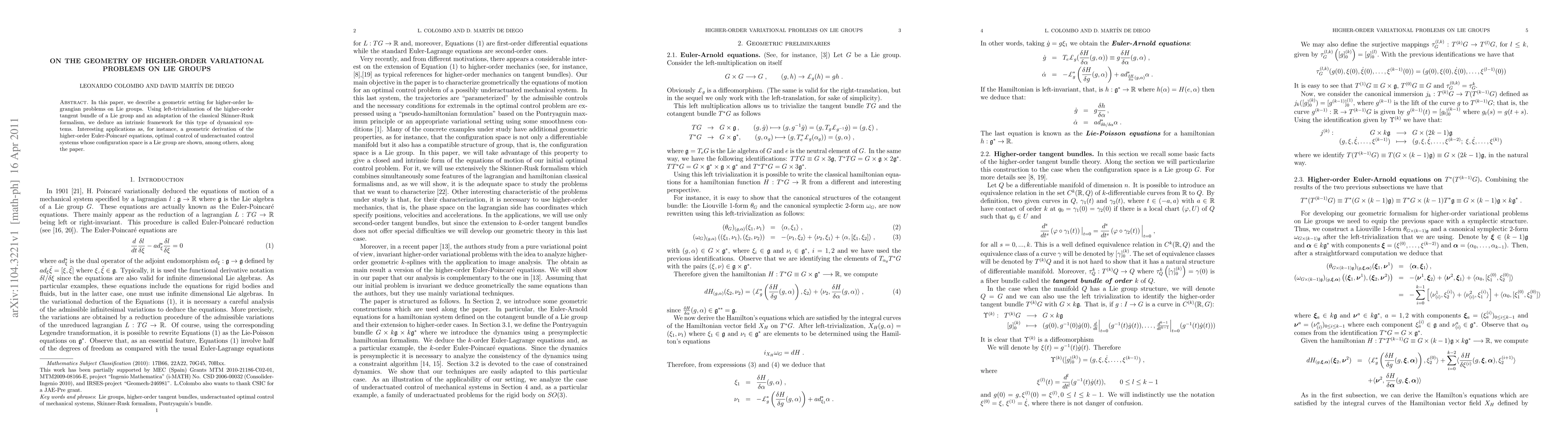 This paper establishes a geometric framework for higher-order Lagrangian problems on Lie groups using left-trivialization of the higher-order tangent bundle and an adapted Skinner-Rusk formalism. It demonstrates applications including the derivation of higher-order Euler-Poincaré equations and optimal control of underactuated systems.