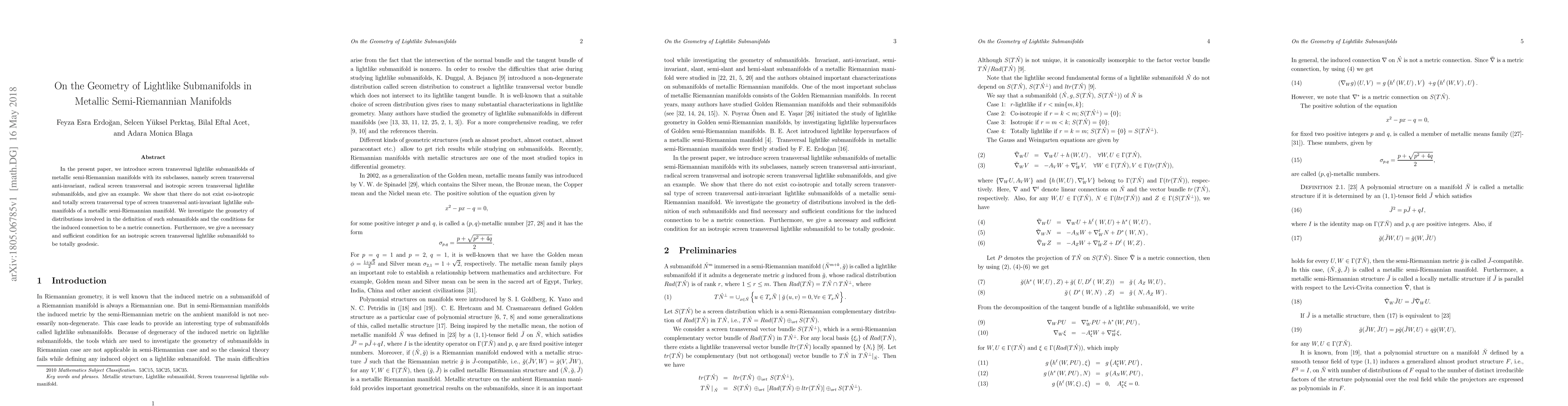 This paper introduces various types of screen transversal lightlike submanifolds within metallic semi-Riemannian manifolds, exploring their geometry and distribution conditions. It concludes that certain types, like co-isotropic and totally screen transversal, do not exist, and provides a necessary and sufficient condition for isotropic screen transversal lightlike submanifolds to be totally geodesic.