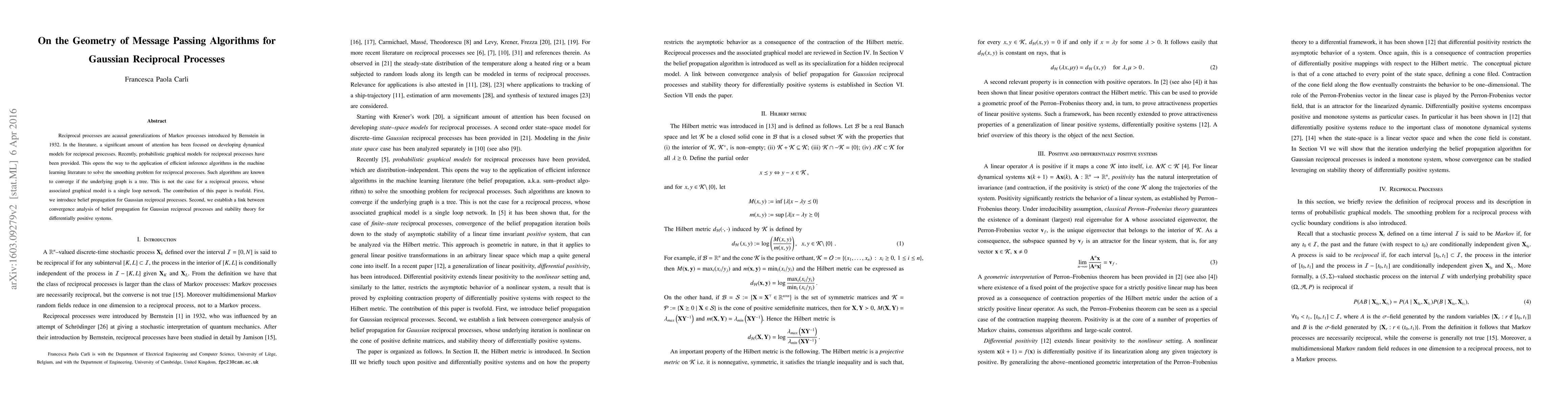 This paper introduces belief propagation for Gaussian reciprocal processes, extending efficient inference algorithms to solve the smoothing problem. It also establishes a connection between convergence analysis of these algorithms and stability theory for differential positive systems.