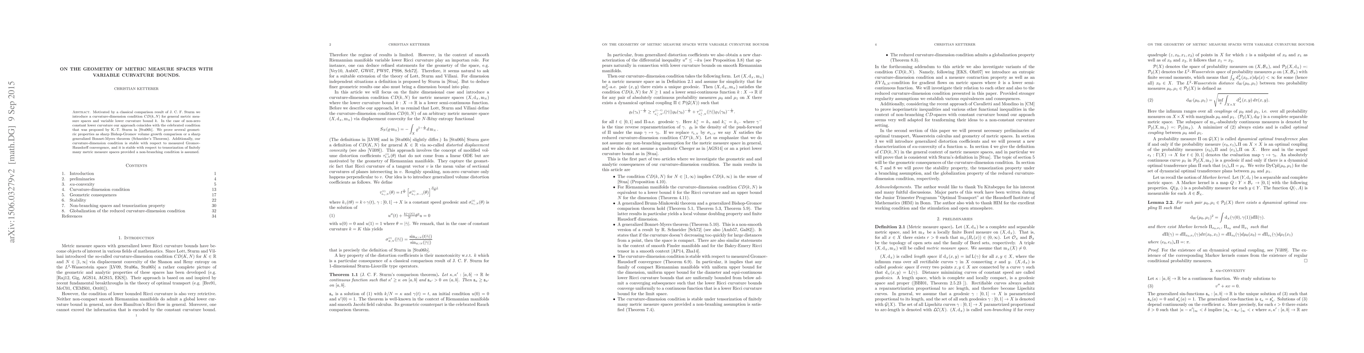 This paper introduces a curvature-dimension condition CD(k,N) for metric measure spaces with variable lower curvature bounds, proving geometric properties like sharp Bishop-Gromov volume comparison and a generalized Bonnet-Myers theorem. The condition is shown to be stable under measured Gromov-Hausdorff convergence and tensorization under non-branching conditions.