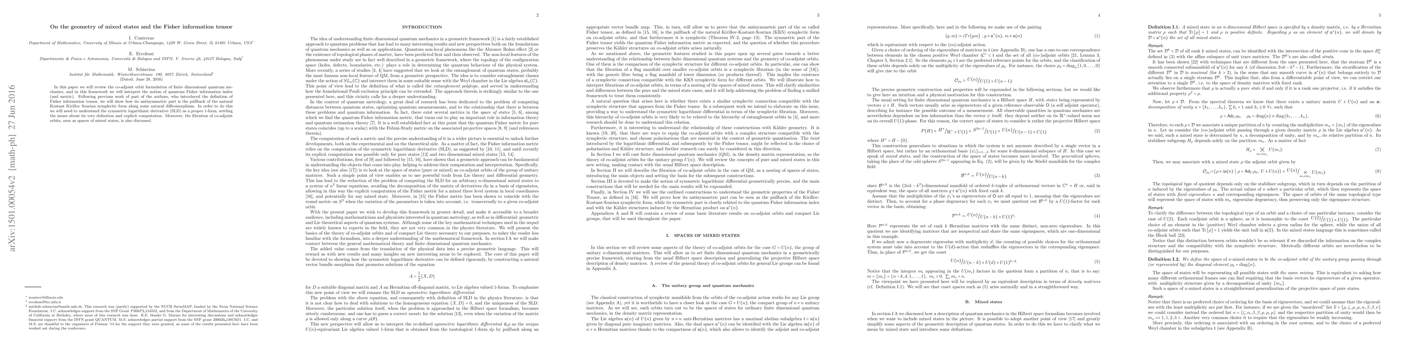 This paper reviews the co-adjoint orbit formulation of quantum mechanics, interpreting the quantum Fisher information tensor and its antisymmetric part, which is shown to be the pullback of the Kostant-Kirillov-Souriau symplectic form. The study also addresses the symmetric logarithmic derivative as a proper 1-form and discusses the fibration of co-adjoint orbits as spaces of mixed states.