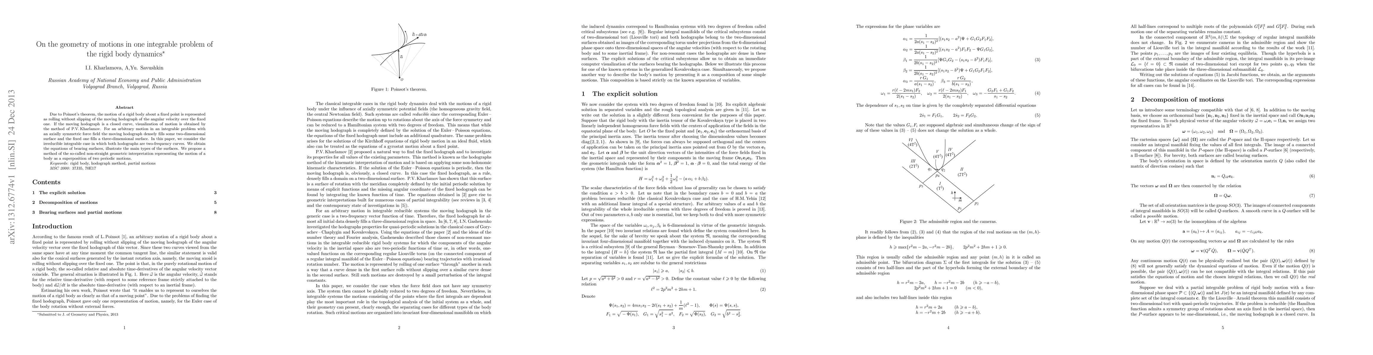 Due to Poinsot's theorem, the motion of a rigid body about a fixed point is represented as rolling without slipping of the moving hodograph of the angular velocity over the fixed one. If the moving hodograph is a closed curve, visualization of motion is obtained by the method of P.V.Kharlamov. For an arbitrary motion in an integrable problem with an axially symmetric force field the moving hodograph densely fills some two-dimensional surface and the fixed one fills a three-dimensional surface. In this paper, we consider the irreducible integrable case in which both hodographs are two-frequency curves. We obtain the equations of bearing surfaces, illustrate the main types of the surfaces. We propose a method of the so-called non-straight geometric interpretation representing the motion of a body as a superposition of two periodic motions.