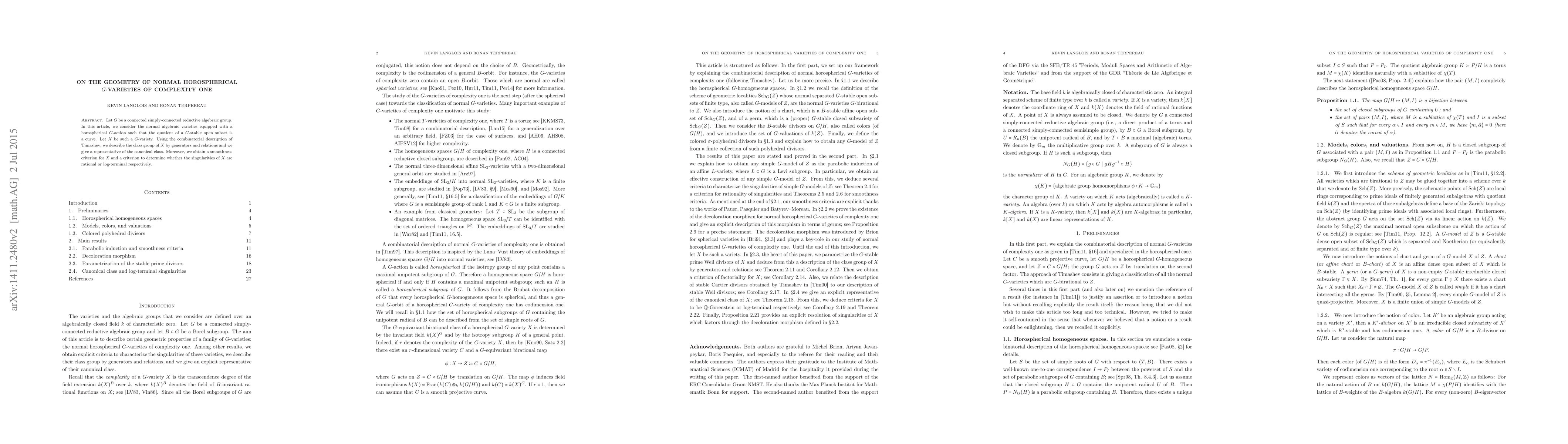 This paper explores normal horospherical G-varieties of complexity one, focusing on their class group and singularities. It provides a combinatorial description to determine the class group, offers a smoothness criterion, and identifies conditions for rational or log-terminal singularities.