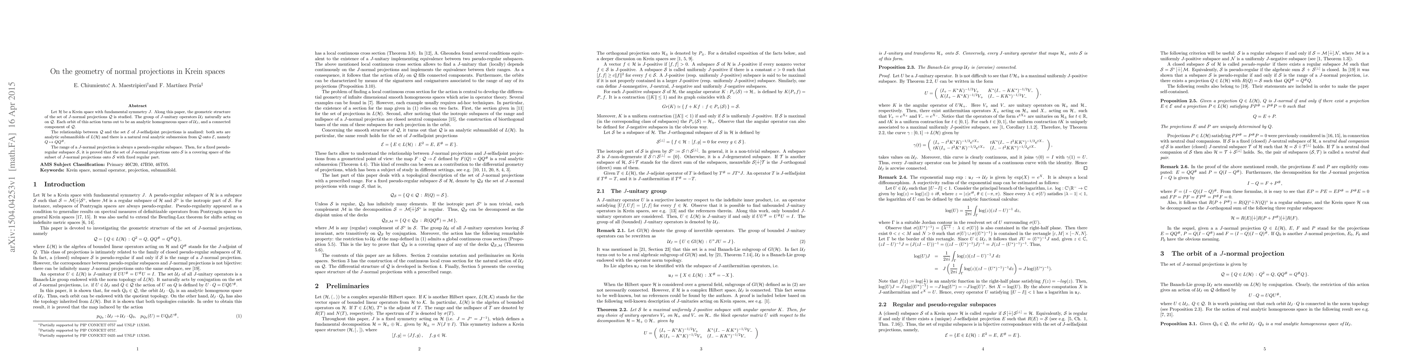 Let $\mathcal{H}$ be a Krein space with fundamental symmetry $J$. Along this paper, the geometric structure of the set of $J$-normal projections $\mathcal{Q}$ is studied. The group of $J$-unitary operators $\mathcal{U}_J$ naturally acts on $\mathcal{Q}$. Each orbit of this action turns out to be an analytic homogeneous space of $\mathcal{U}_J$, and a connected component of $\mathcal{Q}$. The relationship between $\mathcal{Q}$ and the set $\mathcal{E}$ of $J$-selfadjoint projections is analized: both sets are analytic submanifolds of $L(\mathcal{H})$ and there is a natural real analytic submersion from $\mathcal{Q}$ onto $\mathcal{E}$, namely $Q\mapsto QQ^\#$. The range of a $J$-normal projection is always a pseudo-regular subspace. Then, for a fixed pseudo-regular subspace $\mathcal{S}$, it is proved that the set of $J$-normal projections onto $\mathcal{S}$ is a covering space of the subset of $J$-normal projections onto $\mathcal{S}$ with fixed regular part.