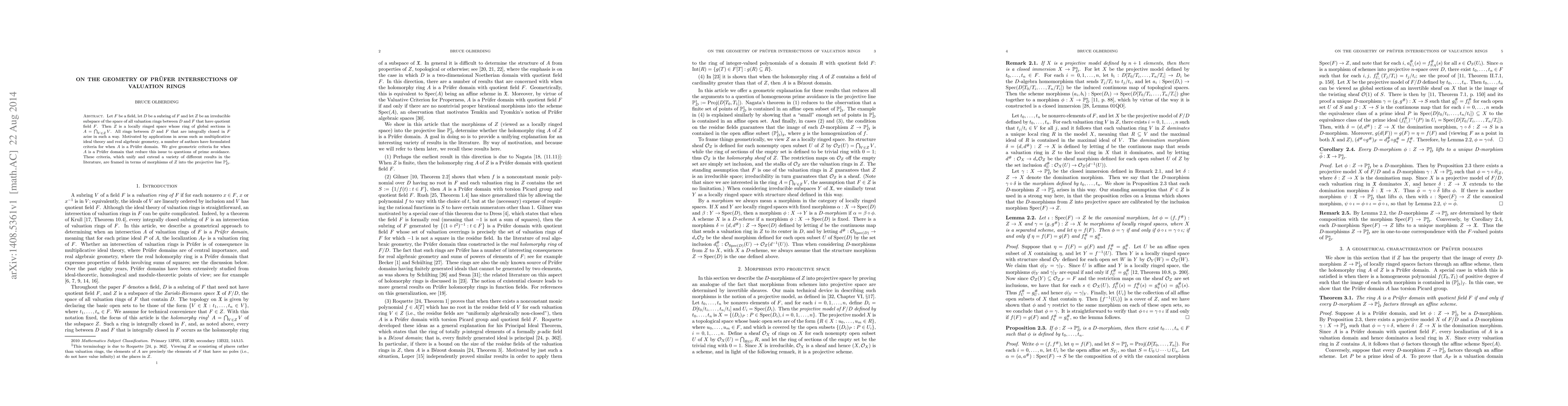 Let $F$ be a field, let $D$ be a subring of $F$ and let $Z$ be an irreducible subspace of the space of all valuation rings between $D$ and $F$ that have quotient field $F$. Then $Z$ is a locally ringed space whose ring of global sections is $A = \bigcap_{V \in Z}V$. All rings between $D$ and $F$ that are integrally closed in $F$ arise in such a way. Motivated by applications in areas such as multiplicative ideal theory and real algebraic geometry, a number of authors have formulated criteria for when $A$ is a Pr\"ufer domain. We give geometric criteria for when $A$ is a Pr\"ufer domain that reduce this issue to questions of prime avoidance. These criteria, which unify and extend a variety of different results in the literature, are framed in terms of morphisms of $Z$ into the projective line ${\mathbb{P}}^1_D$