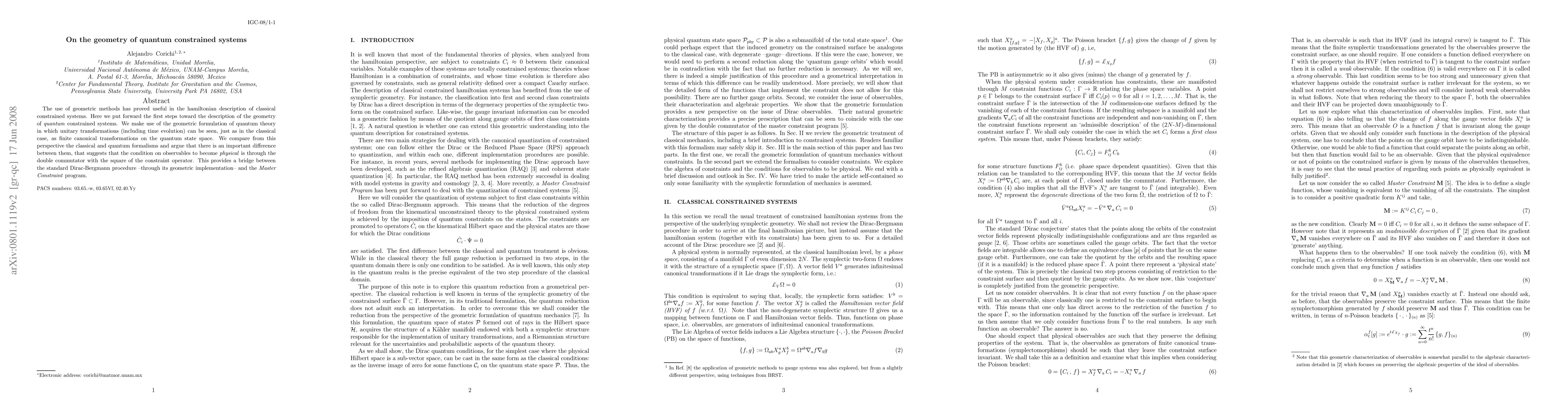 The use of geometric methods has proved useful in the hamiltonian description of classical constrained systems. In this note we provide the first steps toward the description of the geometry of quantum constrained systems. We make use of the geometric formulation of quantum theory in which unitary transformations (including time evolution) can be seen, just as in the classical case, as finite canonical transformations on the quantum state space. We compare from this perspective the classical and quantum formalisms and argue that there is an important difference between them, that suggests that the condition on observables to become physical is through the double commutator with the square of the constraint operator. This provides a bridge between the standard Dirac procedure --through its geometric implementation-- and the Master Constraint program.