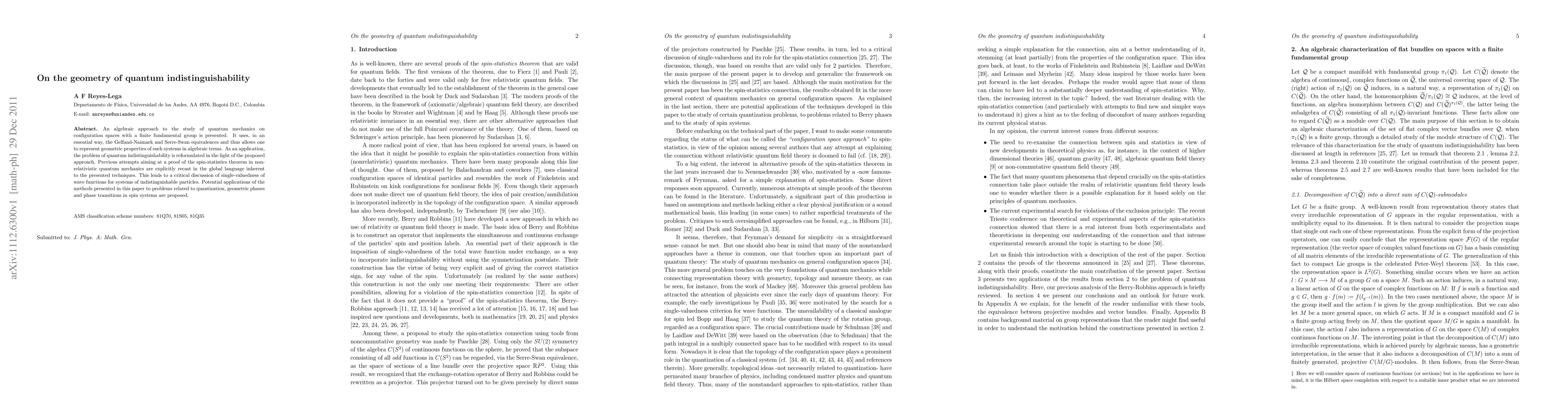 An algebraic approach to the study of quantum mechanics on configuration spaces with a finite fundamental group is presented. It uses, in an essential way, the Gelfand-Naimark and Serre-Swan equivalences and thus allows one to represent geometric properties of such systems in algebraic terms. As an application, the problem of quantum indistinguishability is reformulated in the light of the proposed approach. Previous attempts aiming at a proof of the spin-statistics theorem in non-relativistic quantum mechanics are explicitly recast in the global language inherent to the presented techniques. This leads to a critical discussion of single-valuedness of wave functions for systems of indistinguishable particles. Potential applications of the methods presented in this paper to problems related to quantization, geometric phases and phase transitions in spin systems are proposed.
