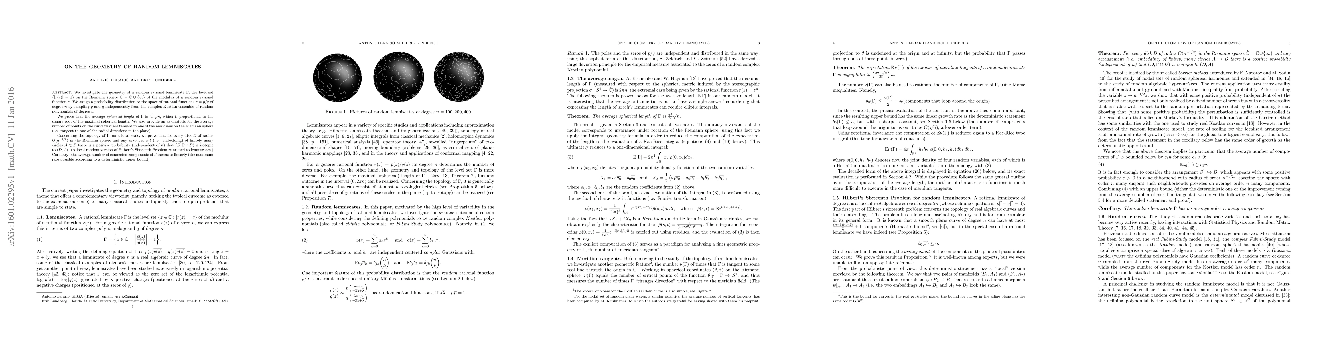This paper explores the geometry of random lemniscates defined by the level set of random rational functions on the Riemann sphere. It proves the average spherical length scales as $\frac{\pi^2}{2} \sqrt{n}$ and provides an asymptotic for tangent points. It also shows that the local topology of these lemniscates resembles that of any arrangement of finitely many circles with positive probability, leading to a linear increase in the average number of connected components.