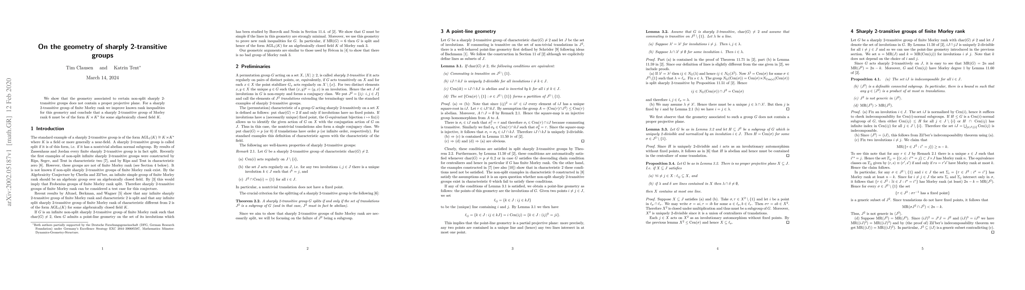 We show that the geometry associated to certain non-split sharply 2-transitive groups does not contain a proper projective plane. For a sharply 2-transitive group of finite Morley rank we improve known rank inequalities for this geometry and conclude that a sharply 2-transitive group of Morley rank 6 must be of the form $K\rtimes K^*$ for some algebraically closed field $K$.