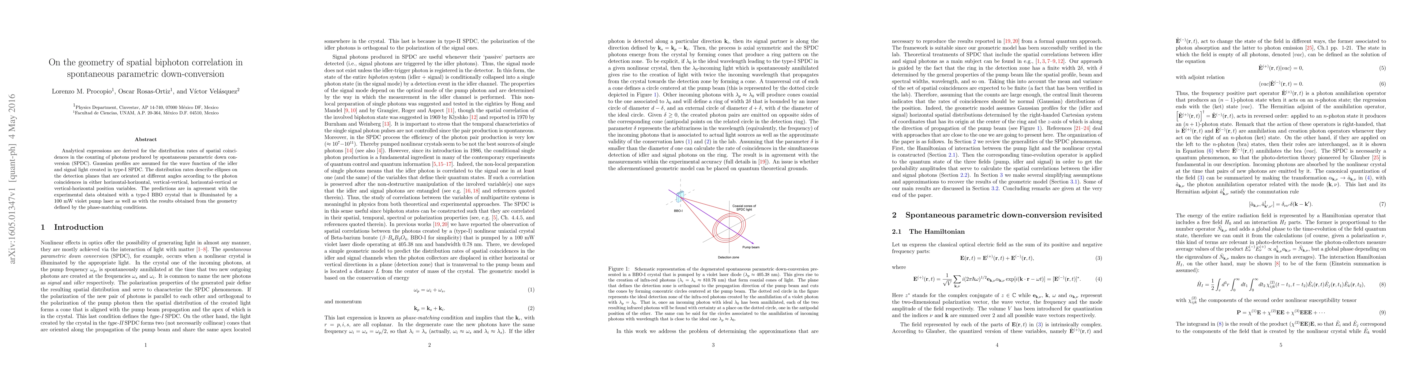 Researchers derived analytical expressions for spatial coincidence rates in spontaneous parametric down-conversion, predicting ellipses on detection planes with specific orientation angles based on photon position variables.