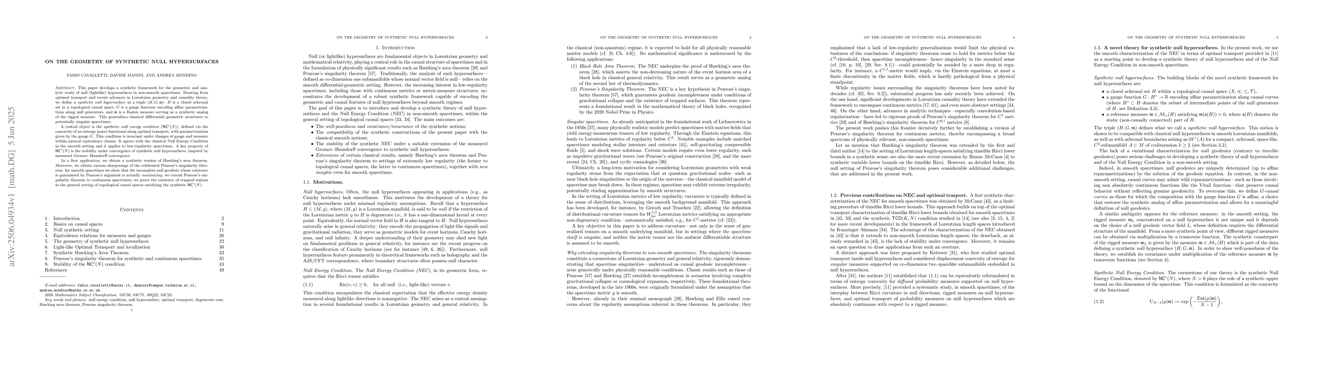 The paper develops a synthetic framework for null hypersurfaces in non-smooth spacetimes, generalizing classical structures using concepts from optimal transport, Lorentzian geometry, and causality theory.
