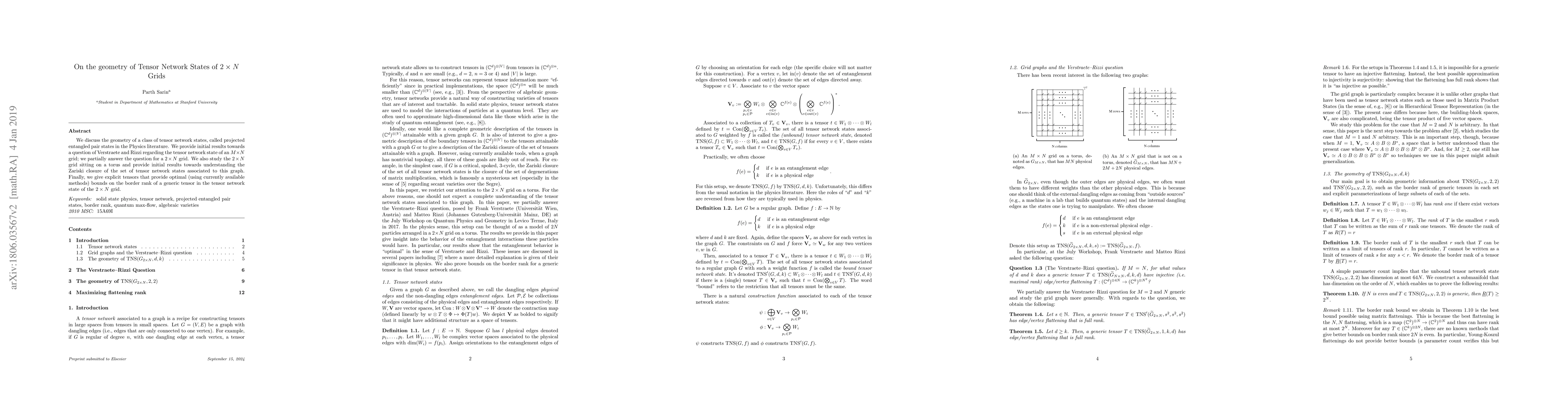 We discuss the geometry of a class of tensor network states, called projected entangled pair states in the Physics literature. We provide initial results towards a question of Verstraete and Rizzi regarding the tensor network state of an $M \times N$ grid; we partially answer the question for a $2 \times N$ grid. We also study the $2 \times N$ grid sitting on a torus and provide initial results towards understanding the Zariski closure of the set of tensor network states associated to this graph. Finally, we give explicit tensors that provide optimal (using currently available methods) bounds on the border rank of a generic tensor in the tensor network state of the $2 \times N$ grid.