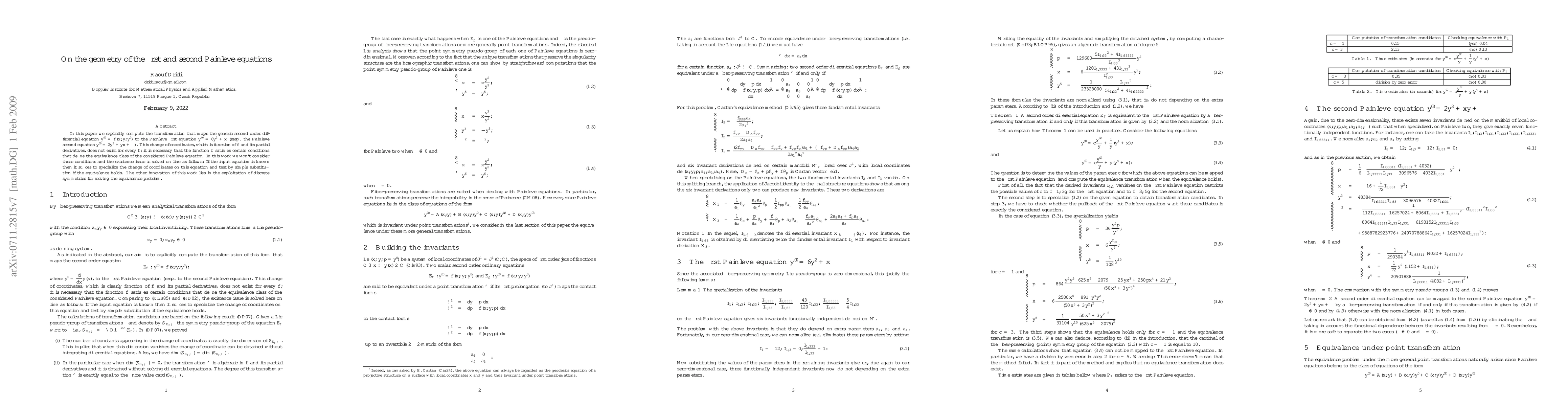 In this paper we \emph{explicitly} compute the transformation that maps the generic second order differential equation $y''= f(x, y, y')$ to the Painlev\'e first equation $y''=6y^2+x$ (resp. the Painlev\'e second equation ${y''=2 y^{3}+yx+ \alpha}$). This change of coordinates, which is function of $f$ and its partial derivatives, does not exist for every $f$; it is necessary that the function $f$ satisfies certain conditions that define the equivalence class of the considered Painlev\'e equation. In this work we won't consider these conditions and the existence issue is solved \emph{on line} as follows: If the input equation is known then it suffices to specialize the change of coordinates on this equation and test by simple substitution if the equivalence holds. The other innovation of this work lies in the exploitation of discrete symmetries for solving the equivalence problem.