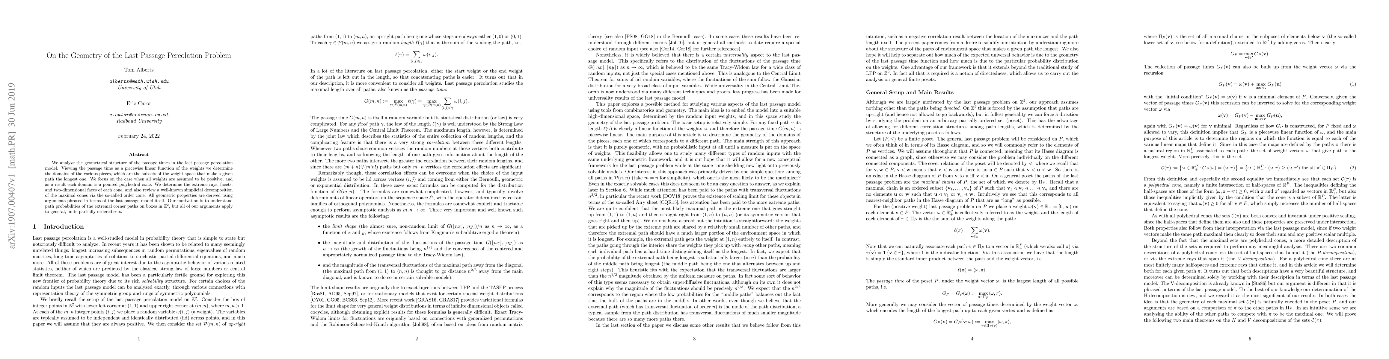 Researchers analyze the geometry of passage times in last passage percolation models to understand path probabilities, focusing on extreme rays, facets, and faces of polyhedral cones representing longest paths.