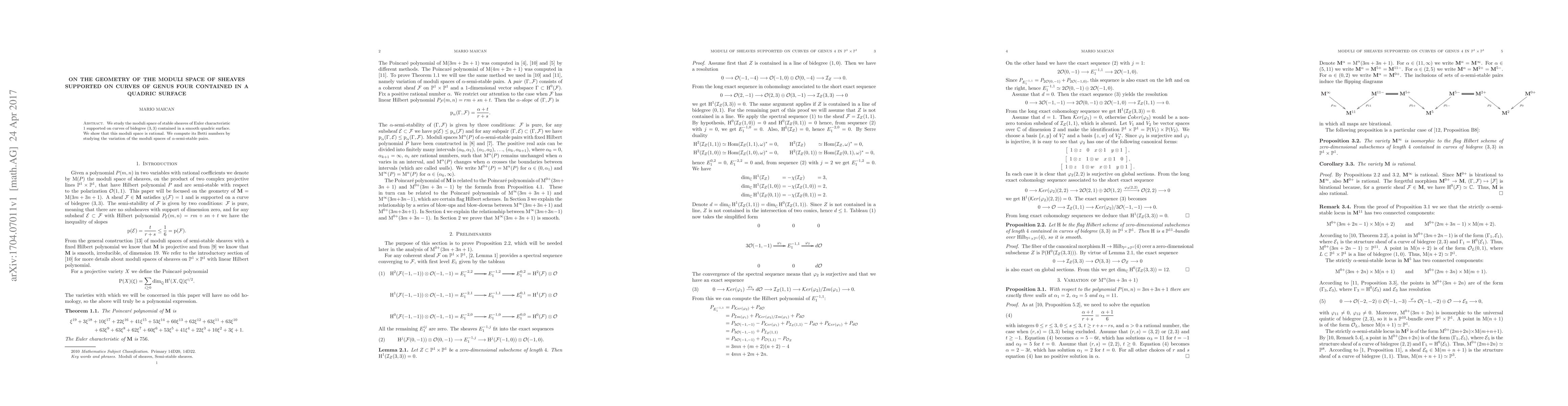 Summary: This paper investigates the rational nature and Betti numbers of the moduli space of stable sheaves with Euler characteristic 1 on genus four curves of bidegree (3, 3) within a smooth quadric surface, utilizing the study of alpha-semi-stable pairs for computations.
