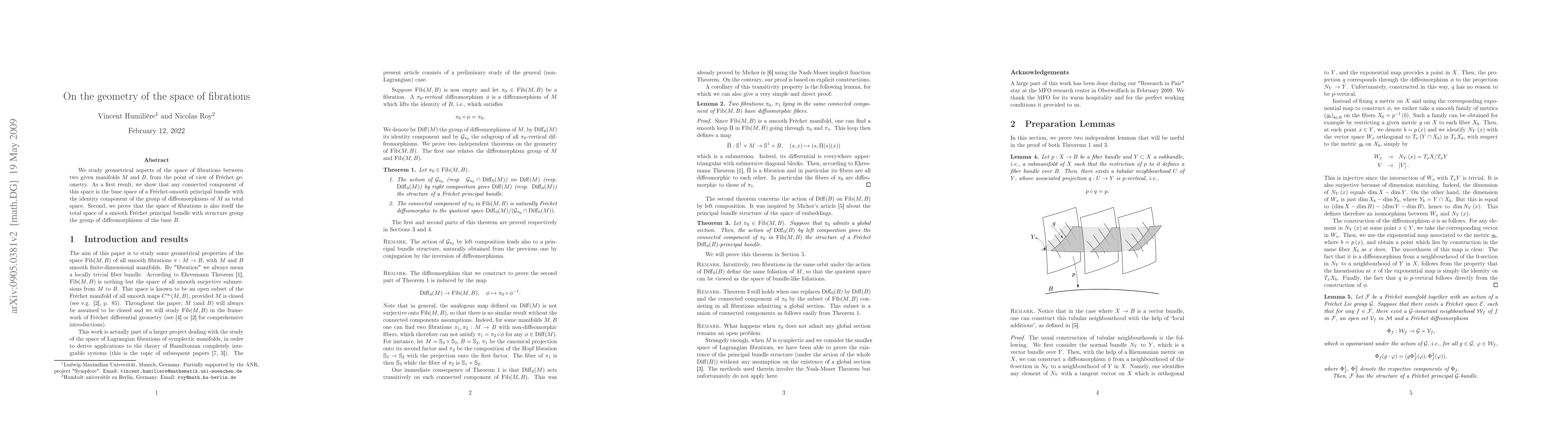 We study geometrical aspects of the space of fibrations between two given manifolds M and B, from the point of view of Frechet geometry. As a first result, we show that any connected component of this space is the base space of a Frechet-smooth principal bundle with the identity component of the group of diffeomorphisms of M as total space. Second, we prove that the space of fibrations is also itself the total space of a smooth Frechet principal bundle with structure group the group of diffeomorphisms of the base B.