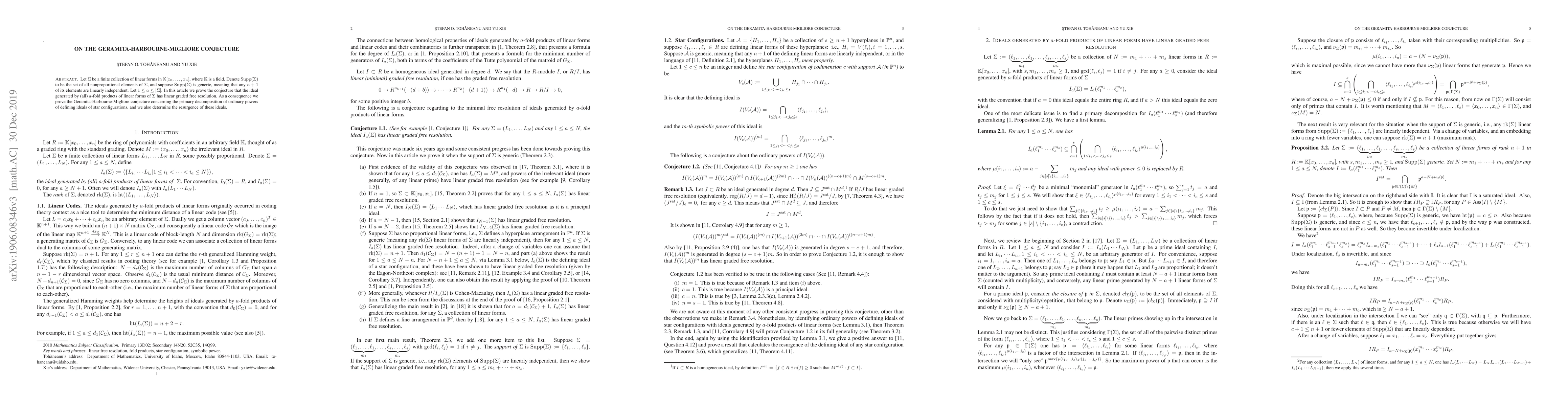 Let $\Sigma$ be a finite collection of linear forms in $\mathbb K[x_0,\ldots,x_n]$, where $\mathbb K$ is a field. Denote ${\rm Supp}(\Sigma)$ to be the set of all nonproportional elements of $\Sigma$, and suppose ${\rm Supp}(\Sigma)$ is generic, meaning that any $n+1$ of its elements are linearly independent. Let $1\leq a\leq |\Sigma|$. In this article we prove the conjecture that the ideal generated by (all) $a$-fold products of linear forms of $\Sigma$ has linear graded free resolution. As a consequence we prove the Geramita-Harbourne-Migliore conjecture concerning the primary decomposition of ordinary powers of defining ideals of star configurations, and we also determine the resurgence of these ideals.