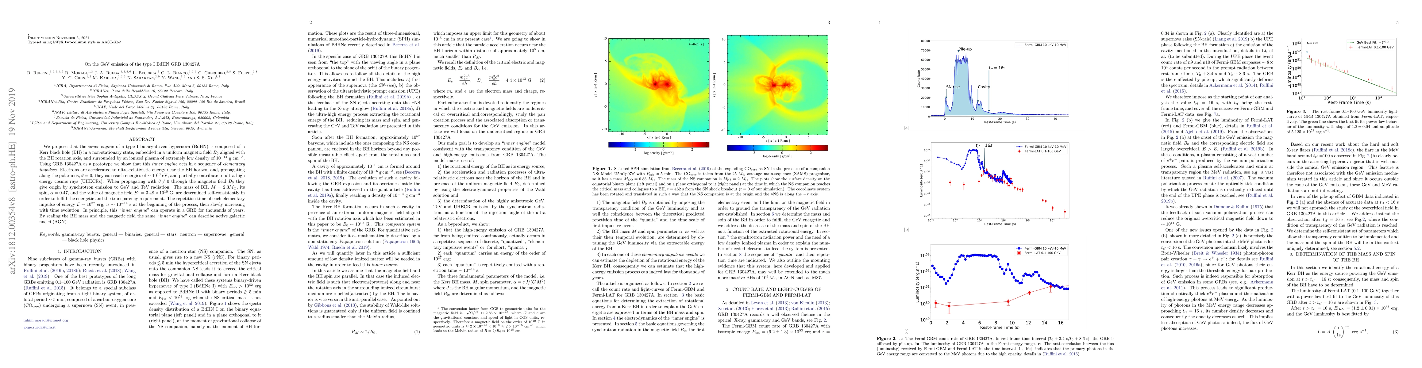 We propose that the "inner engine" of a type I binary-driven hypernova (BdHN) is composed of a Kerr black hole (BH) in a non-stationary state, embedded in a uniform magnetic field $B_0$ aligned with the BH rotation axis, and surrounded by an ionized plasma of extremely low density of $10^{-14}$~g~cm$^{-3}$. Using GRB 130427A as a prototype we show that this "inner engine" acts in a sequence of "elementary impulses". Electrons are accelerated to ultra-relativistic energy near the BH horizon and, propagating along the polar axis, $\theta =0$, they can reach energies of $\sim 10^{18}$ eV, and partially contribute to ultra-high energy cosmic rays (UHECRs). When propagating with ${\theta \neq 0}$ through the magnetic field $B_0$ they give origin by synchrotron emission to GeV and TeV radiation. The mass of BH, $M=2.3 M_\odot$, its spin, $\alpha = 0.47$, and the value of magnetic field $B_0= 3.48 \times 10^{10}$ G, are determined self-consistently in order to fulfill the energetic and the transparency requirement. The repetition time of each elementary impulse of energy ${\cal E} \sim 10^{37}$ erg, is $\sim 10^{-14}$ s at the beginning of the process, then slowly increasing with time evolution. In principle, this "\textit{inner engine}" can operate in a GRB for thousands of years. By scaling the BH mass and the magnetic field the same "inner engine" can describe active galactic nuclei (AGN).