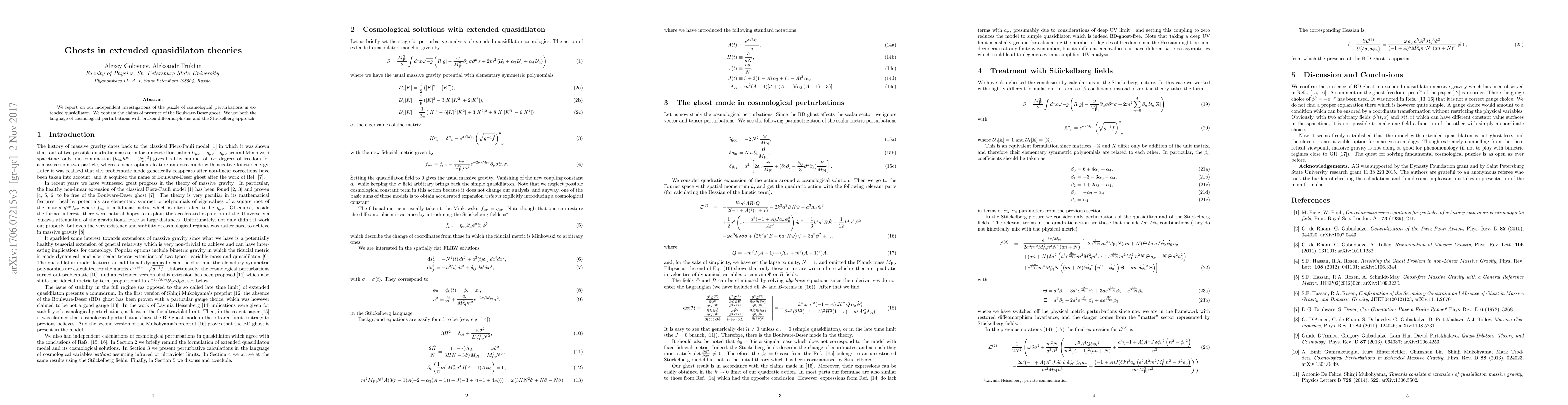 We report on our independent investigations of the puzzle of cosmological perturbations in extended quasidilaton. We confirm the claims of presence of the Boulware-Deser ghost. We use both the language of cosmological perturbations with broken diffeomorphisms and the Stuckelberg approach.