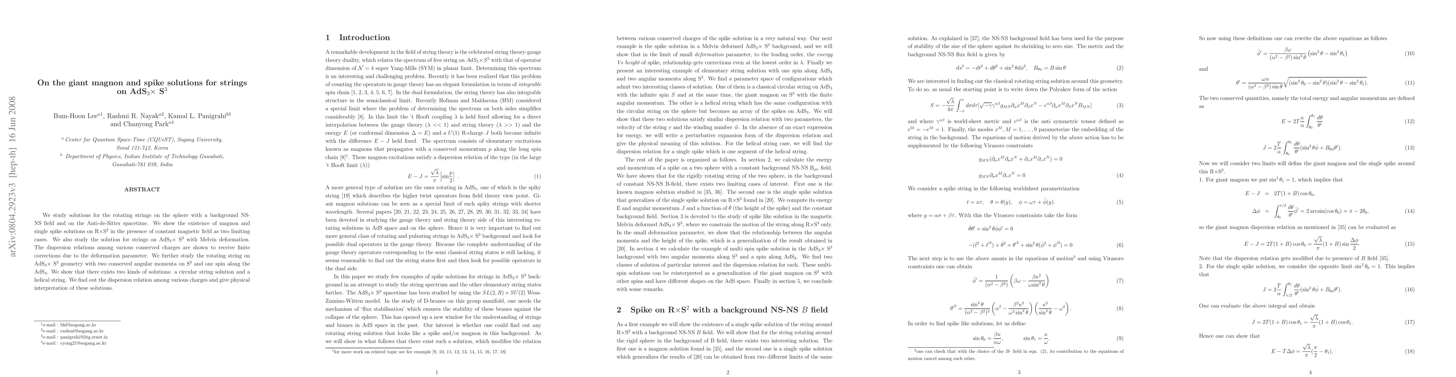We study solutions for the rotating strings on the sphere with a background NS-NS field and on the Anti-de-Sitter spacetime. We show the existence of magnon and single spike solutions on R$\times$S$^2$ in the presence of constant magnetic field as two limiting cases. We also study the solution for strings on AdS$_3\times$ S$^3$ with Melvin deformation. The dispersion relations among various conserved charges are shown to receive finite corrections due to the deformation parameter. We further study the rotating string on AdS$_3 \times$ S$^3$ geometry with two conserved angular momenta on S$^3$ and one spin along the AdS$_3$. We show that there exists two kinds of solutions: a circular string solution and a helical string. We find out the dispersion relation among various charges and give physical interpretation of these solutions.