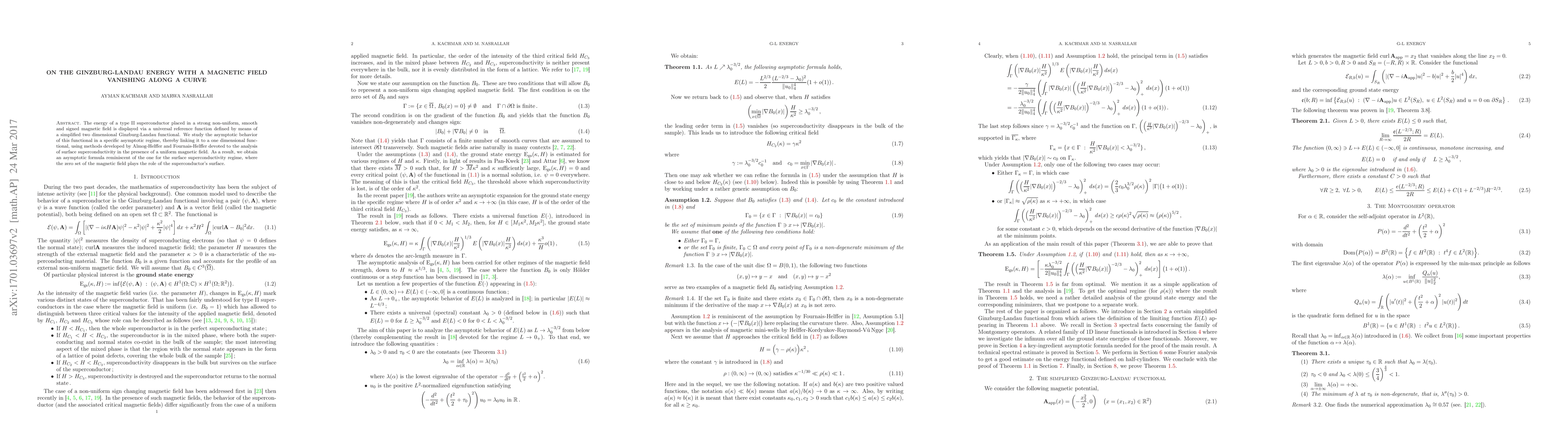 The energy of a type II superconductor placed in a strong non-uniform, smooth and signed magnetic field is displayed via a universal characteristic function defined by means of a simplified two dimensional Ginzburg-Landau functional. We study the asymptotic behavior of this functional in a specific asymptotic regime, thereby linking it to a one dimensional functional, using methods developed by Almog-Helffer and Fournais-Helffer devoted to the analysis of surface superconductivity in the presence of a uniform magnetic field. As a result, we obtain an asymptotic formula reminiscent of the one for the surface superconductivity regime, where the zero set of the magnetic field plays the role of the superconductor's surface.